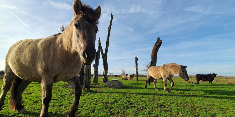 De nieuwe natuur langs de Grensmaas wordt begraasd met konikpaarden en gallowayrunderen. Deze dieren lopen hier het hele jaar en zijn aangepast op het leven buiten. Ze hebben geen hulp van mensen nodig. Ze gaan en staan waar zij willen en ze eten ook wat ze zelf willen. Zo ontstaan er hier en daar bosjes en ergens anders weer vlaktes waar overwinterende ganzen van kunnen profiteren.