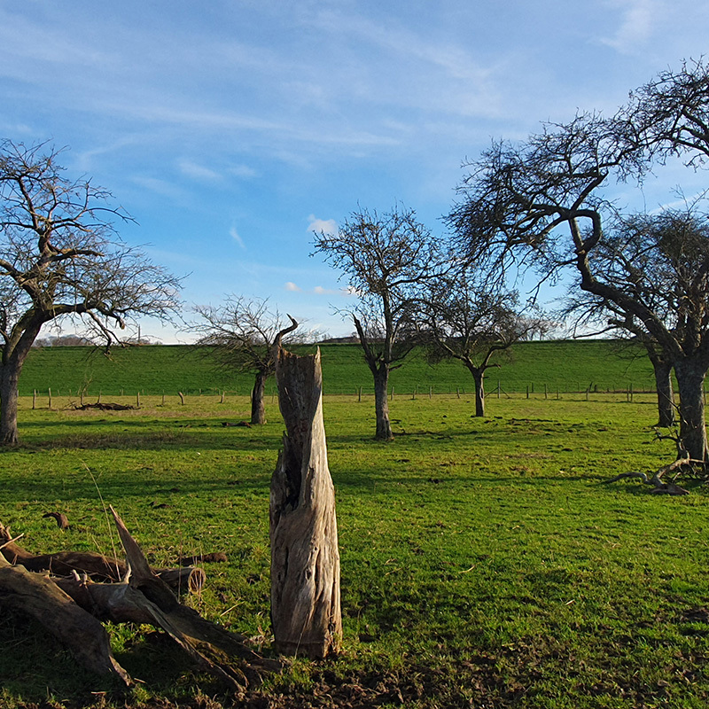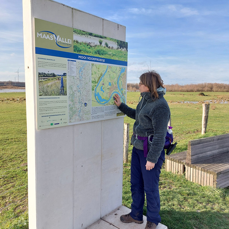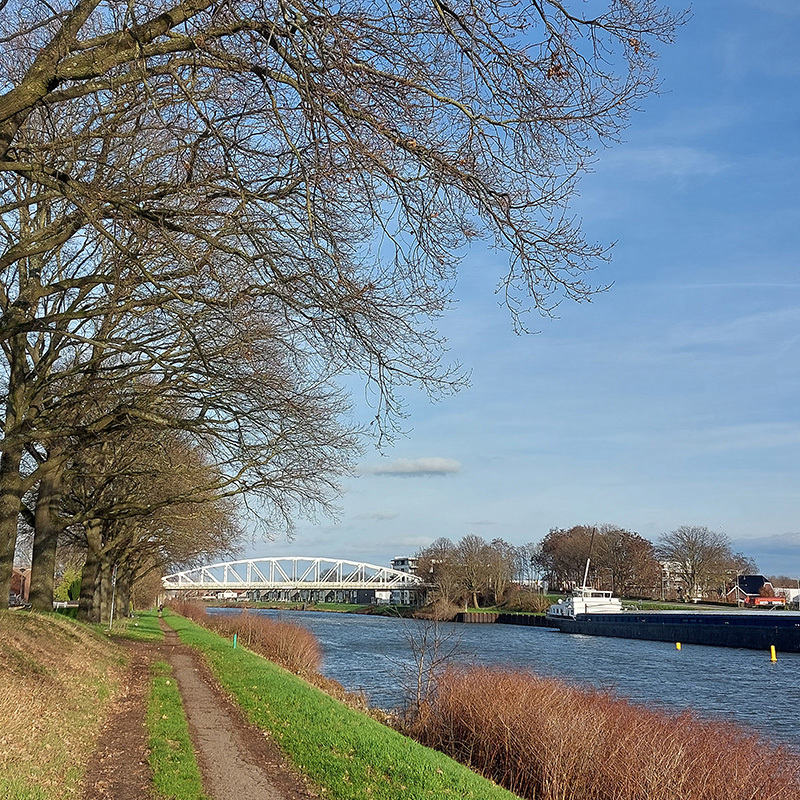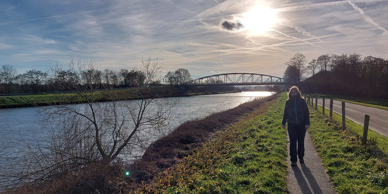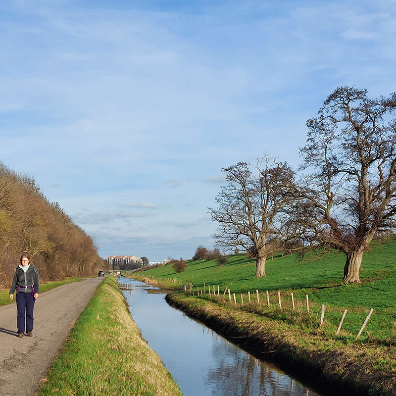 Heerlijk door de landerijen wandelen we naar Oud-Urmond. Het is genieten van de oude fruitbomen en de loop van Ur. Eenmaal in Urmond wacht je een flinke klim omhoog naar de dijk van het Julianakanaal. Wie denkt dat er nu saaie kilometers volgen heeft het mis. Weliswaar is de dijk recht, maar wie goed kijkt, ziet de sporen van bevervraat aan de bomen langs het kanaal. Natuurlijk is er het uitzicht over de uitwaarden van de Maas en geregeld tuft er een boot voorbij. Zie je die struiken met die enorme doorns? Dat is Christusdoorn. Je kunt je wel voorstellen waar die naam vandaan komt … Voor ik het in de gaten heb, ben ik alweer in Meers. Ik ga niet meteen het dorp in, maar loop nog even buitenom. Langs kleinschalige bosjes, over zandwegen en langs de Grensmaas kom ik aan de achterkant uiteindelijk weer het dorpje in. Tijd voor wat lekkers bij café De Witte Börstel, dat heb ik wel verdiend.