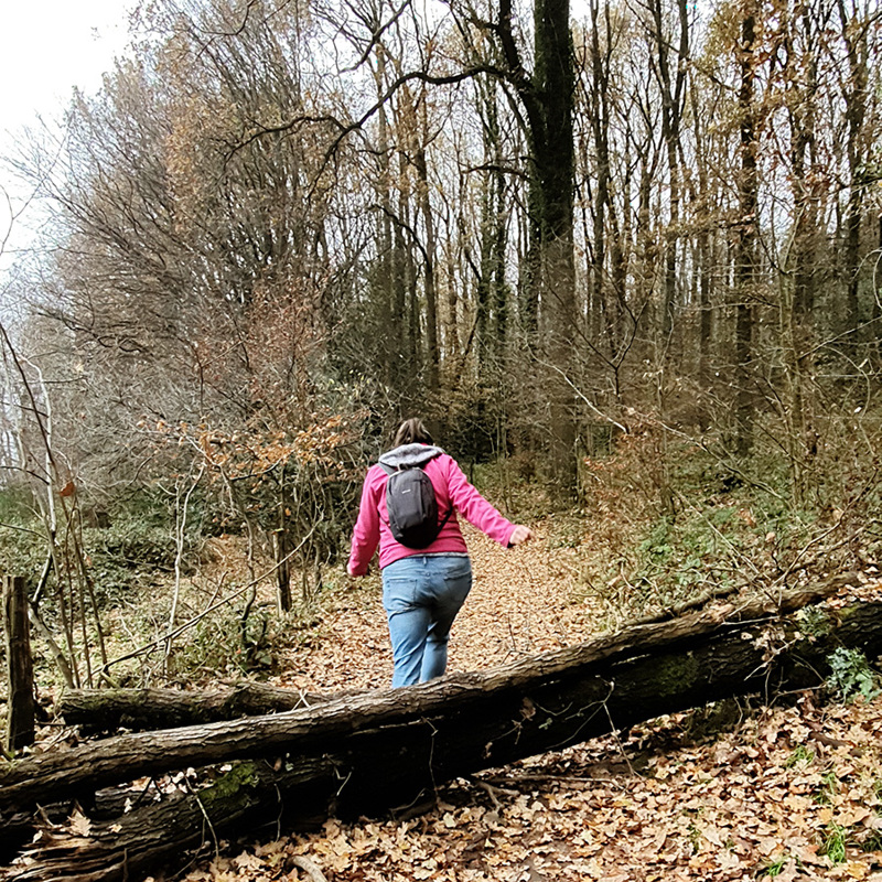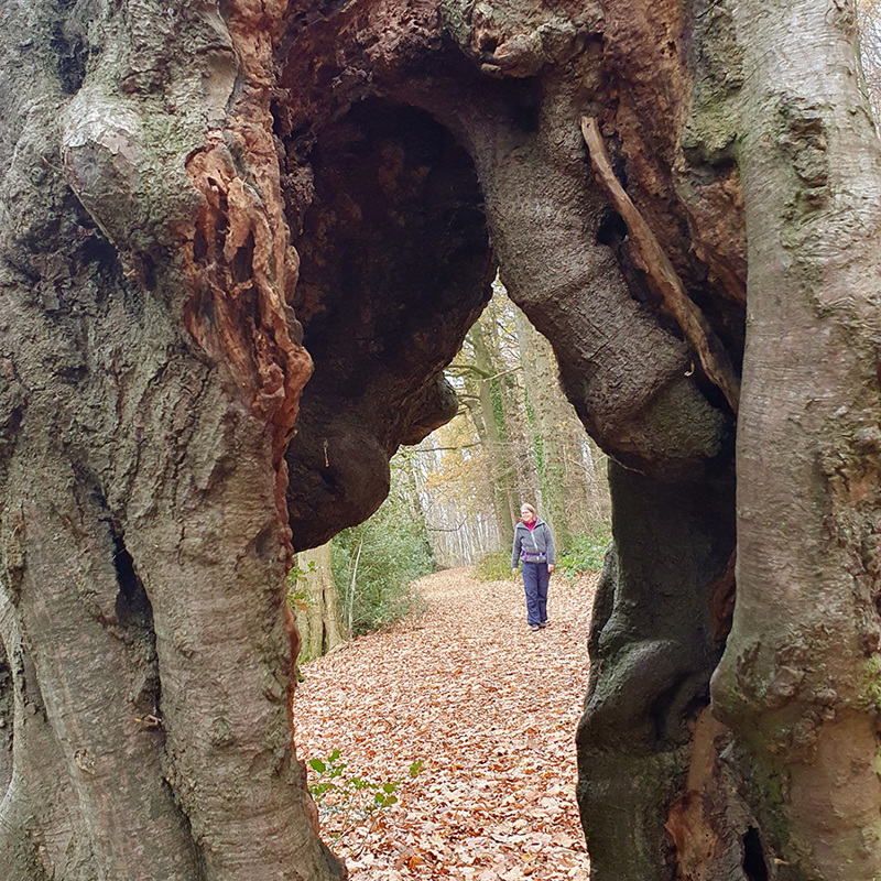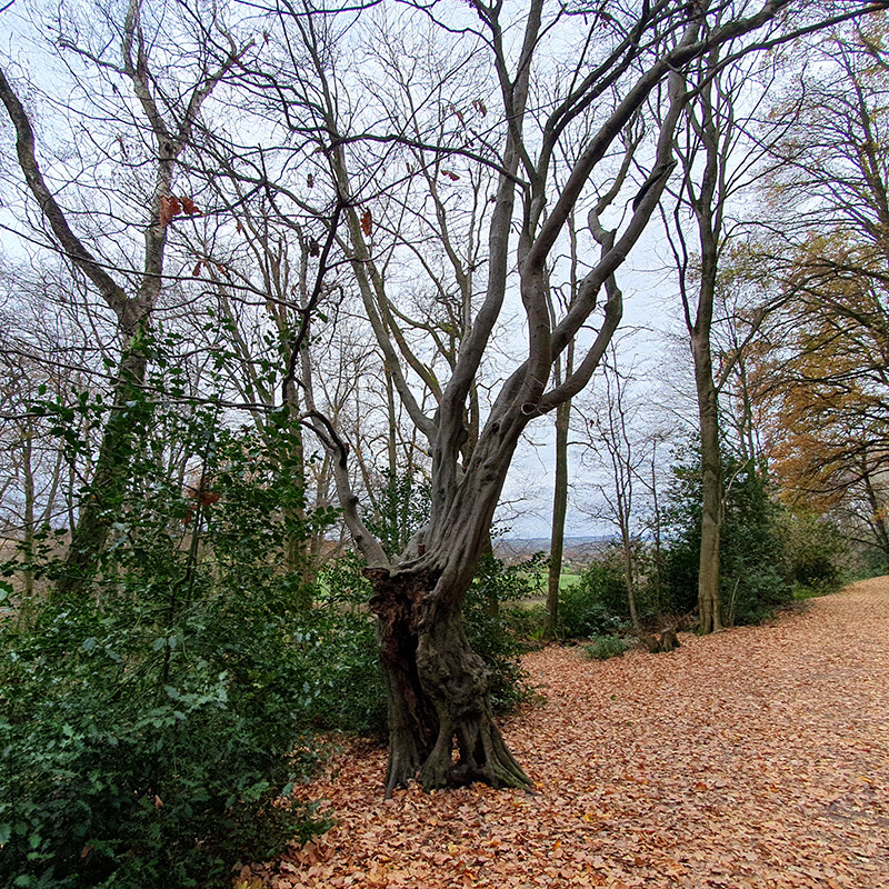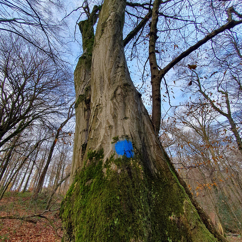 We zijn nog niet op pad of we zien een prachtige haagbeuk met een blauwe stip erop. In de natuurbeheerwereld wordt door middel van een blauwe stip aangegeven dat een boom bijzonder is en dat deze behouden moet blijven voor de toekomst van het bos. De B van blauw en van bewaren, boswachterslogica. Haagbeuken kunnen allerlei boeiende vormen aannemen. Langs deze route zien we er tientallen, de een nog mooier dan de ander.