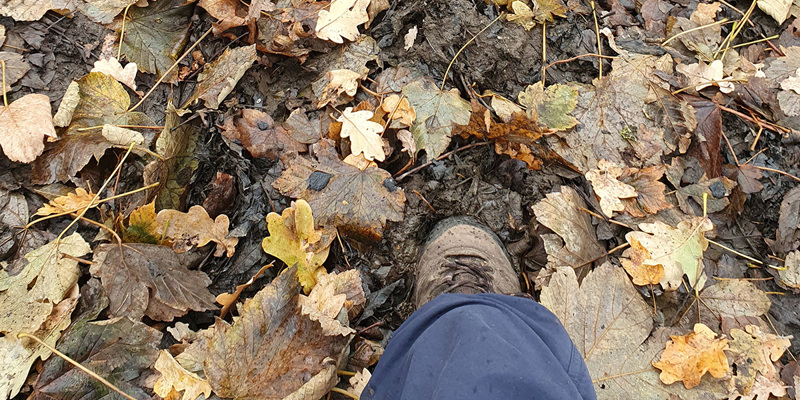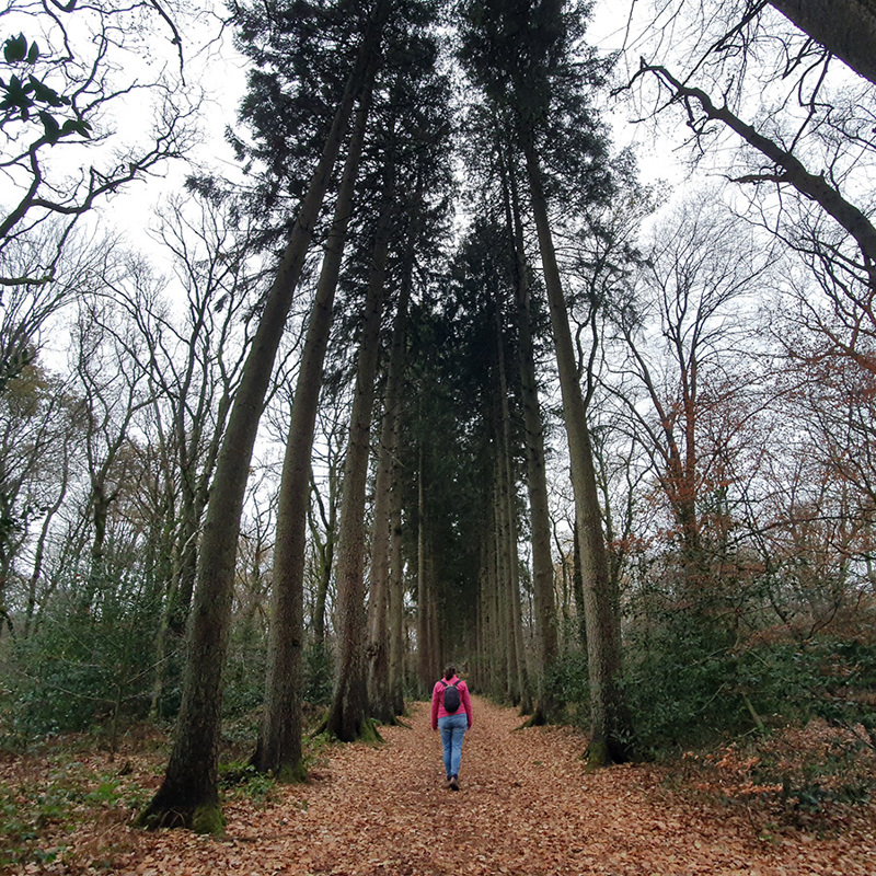 De sparrenlaan is altijd indrukwekkend. Hemelshoog rijzen de bomen boven je uit in een rechte rij. We zijn niet alleen in het bos, geregeld komen we andere genietende mensen tegen. Verwonderlijk, want het weer is inmiddels omgeslagen is wat miezerregen. Net te weinig om te klagen, net te veel om niet nat te worden. Verderop omhelzen een dikke beuk en een eik elkaar innig. Deze vorm van twee verschillende boomsoorten bij elkaar wordt boomkussen genoemd.