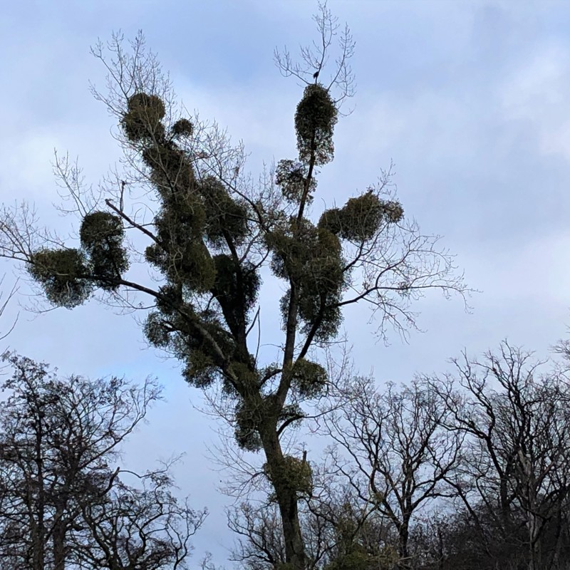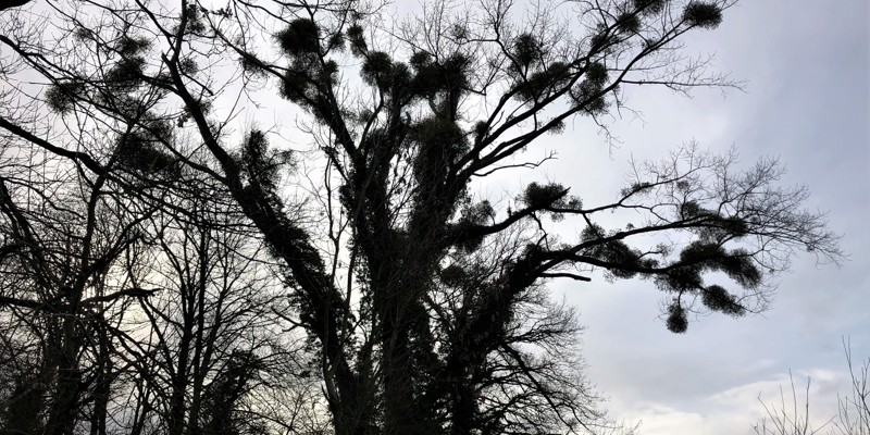Terug naar de plant. Het is een kwestie van ‘tak zoekt boom’. De witte bessen van de maretak worden door lijsters en merels verspreid en zo komt het taaie, kleverige zaad dat in die bessen zit op bomen terecht waar het blijft plakken, ontkiemt en wortel schiet. Die wortel groeit in de boom. De maretak wordt als het ware een valse tak aan de boom. Vanwege die kleverige zaden wordt de maretak ook vogellijm genoemd.