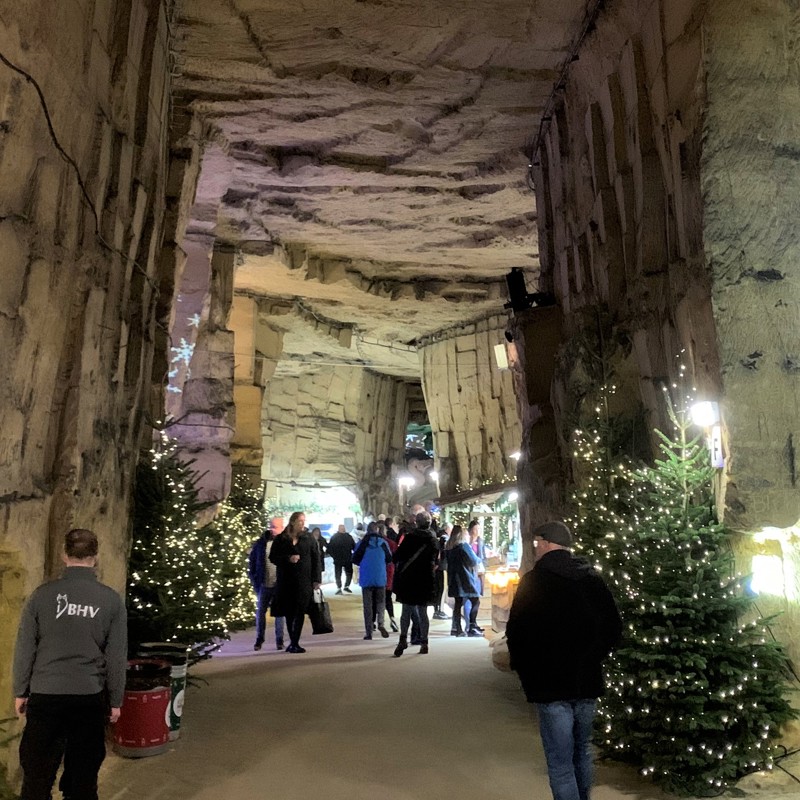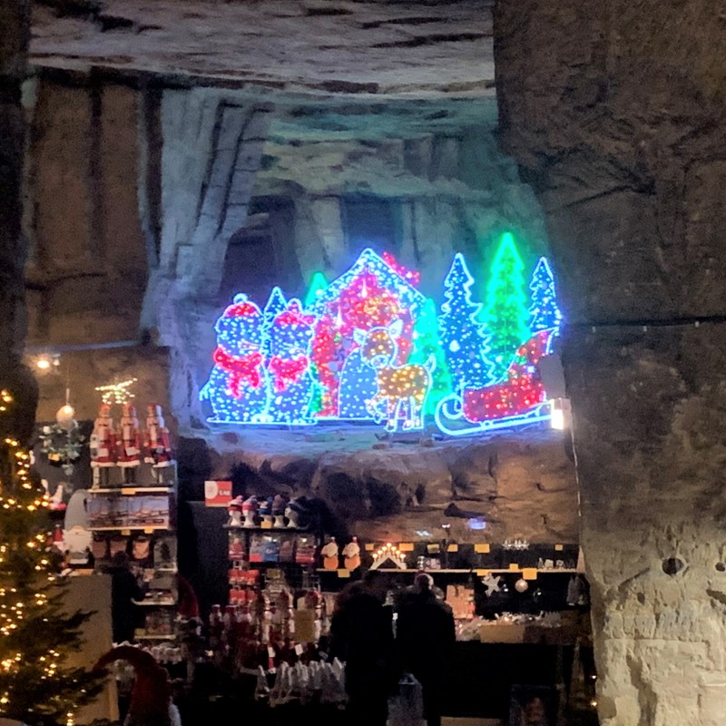 We wandelden door het sfeervol versierde stadje naar de Gemeentegrot. In die grot is van het gangenstelsel van 70 kilometer pakweg twee kilometer ingericht als kerstmarkt. De grot is kerst-feestelijk aangekleed met 600 kerstbomen en liefst twaalf kilometer kerstverlichting. Hoewel ik persoonlijk niet zo’n kerstmarktman ben, moet ik zeggen dat de grot een en al kerstsfeer ademt. En bij de zestig kraampjes kun je van alles kopen om te schenken of om ter plekke te eten en te drinken. De meest bijzondere kraam is toch die waar je spullen gemaakt van mergel kunt kopen.