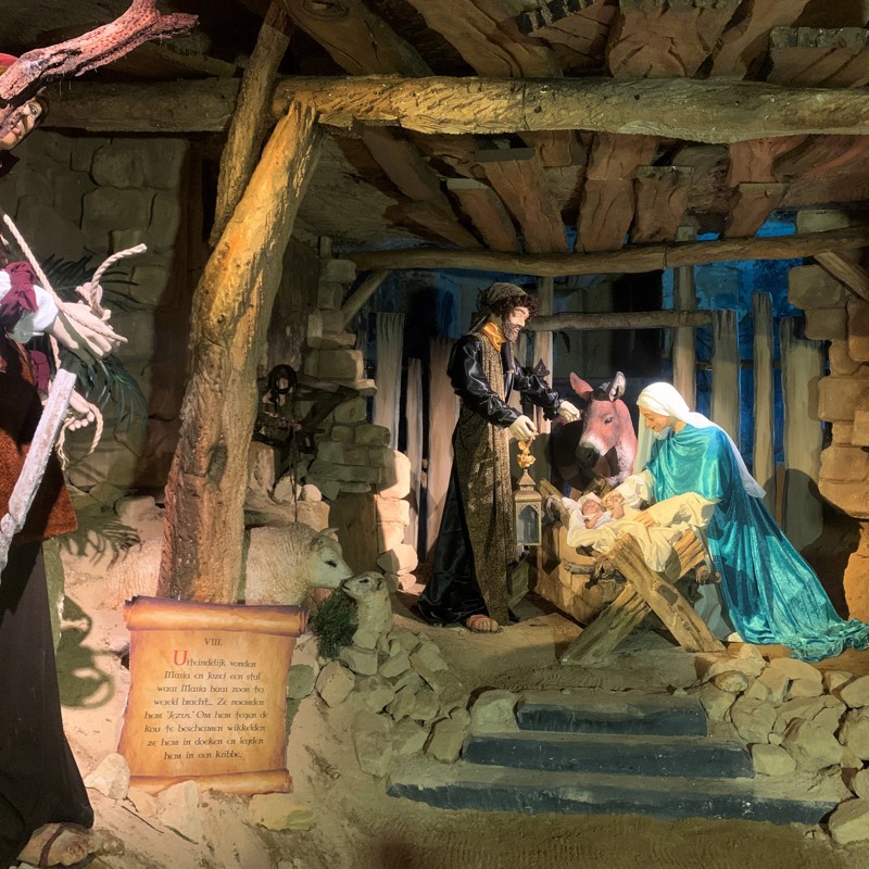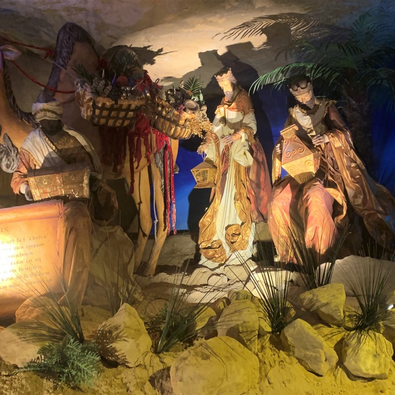Genoeg gekerstmarkt. We willen ook een overdekt kribke zien. Dat vinden we een paar honderd meter verderop in de Wilhelminagroeve. Sinds 2020 wordt in deze voormalige mergelgroeve (bij de kabelbaan) het kerstverhaal verteld. Je wandelt er als het ware door het kerstverhaal heen. Het fraaie kerstdecor is met de hand gemaakt door twee decorontwerpers. Ze maakten alle stukken en figuren van piepschuim. De kleding van de kerstfiguren is ook handwerk. De kleding van Maria, Jozef, het kindje Jezus, de herders en de Drie Wijzen uit het Oosten zijn dit jaar overigens helemaal vernieuwd. Wel volgens de mode van toen, van 2022 jaar geleden.