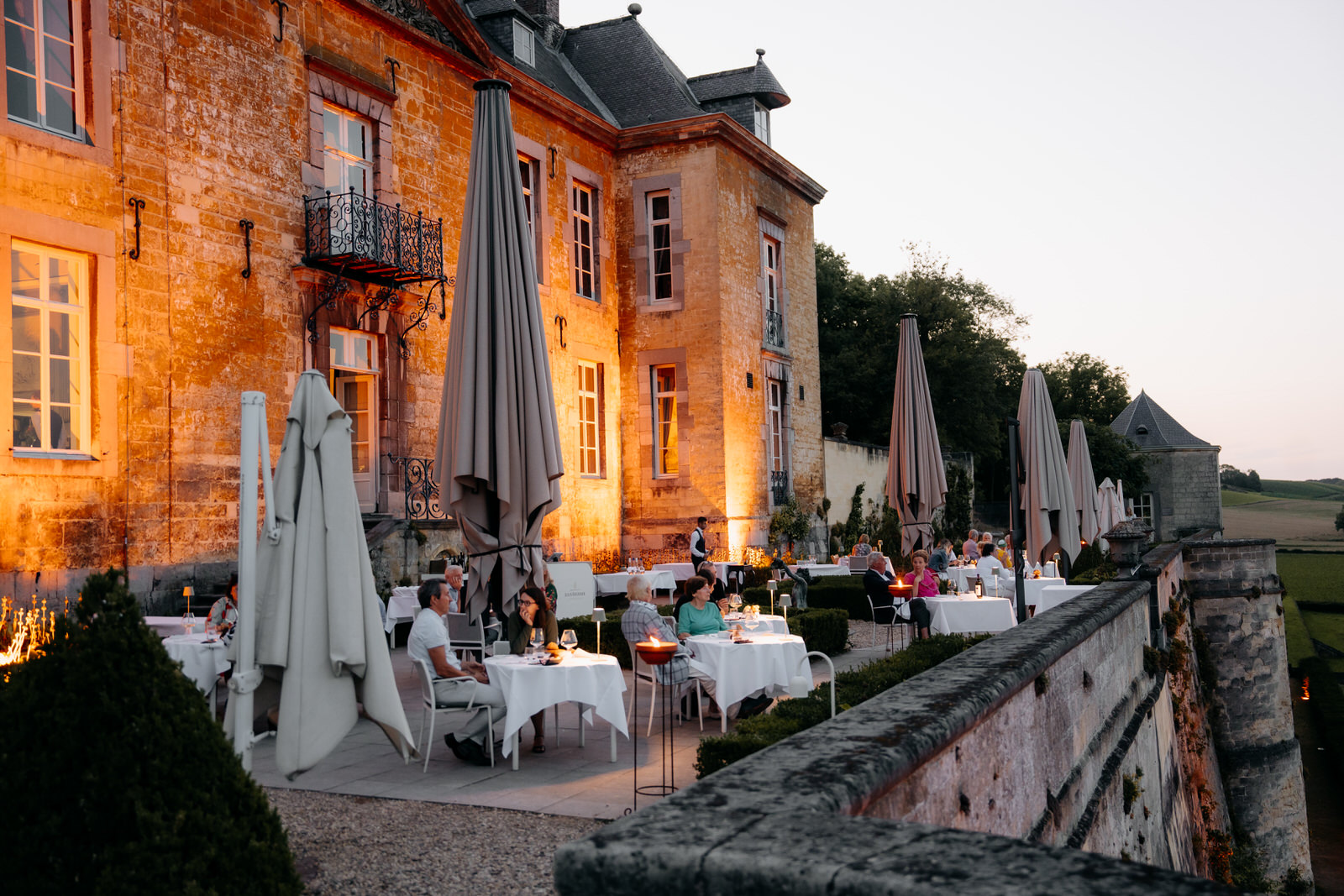 Bij goed weer kun je dineren op het terras met uitzicht over de Jekervallei en de UNESCO-baroktuinen.