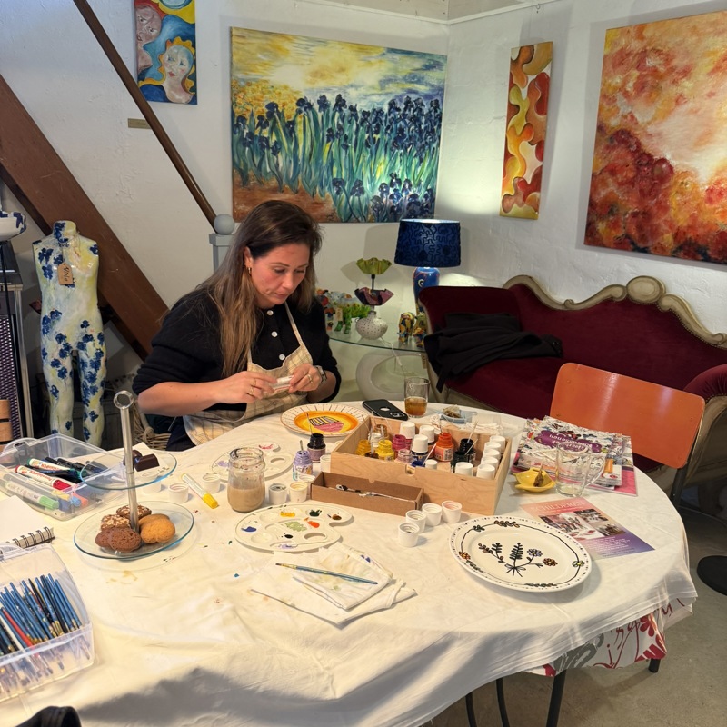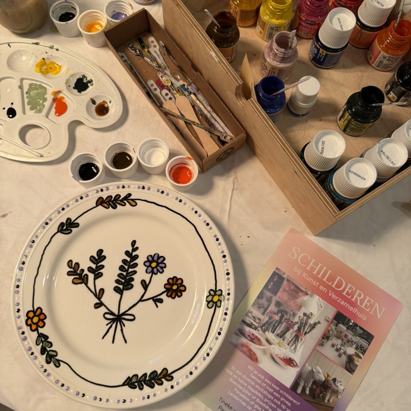 Op tafel liggen boeken vol inspiratie, maar ik kies ervoor om zelf een vrolijk bloemenmotief te ontwerpen. Langzaam komt mijn ontwerp tot leven. Terwijl we schilderen, genieten we van thee, koekjes en bonbons. Twee uur vliegen voorbij en voor we het weten, krijgen we instructies mee om onze borden thuis in de oven af te bakken. Zo blijven ze mooi én afwasbestendig.