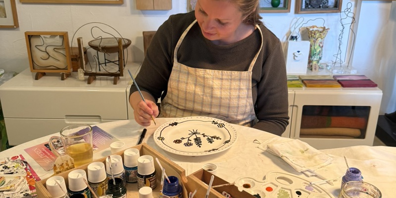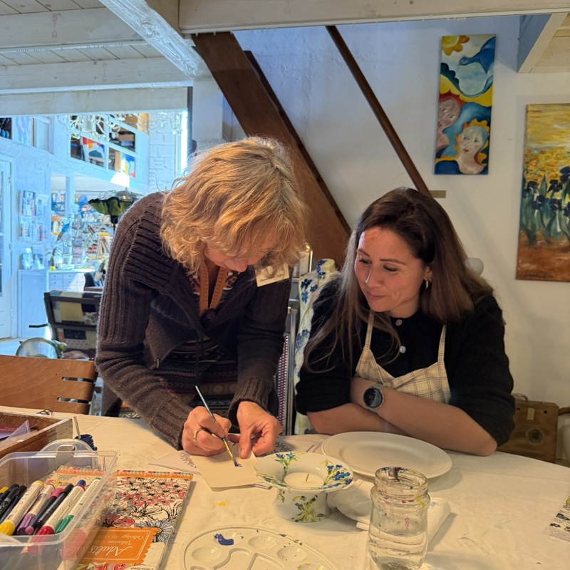 Met een kwast in de ene hand en een kop thee in de andere, dompelen we ons onder in de schilderworkshop bij Kunst- en Verzamelhuis Wijlre. We mogen kiezen uit een porseleinen vaas, bord of kaarsenhoudertje en besluiten allebei voor een bord te gaan. Een blijvende herinnering aan deze middag!