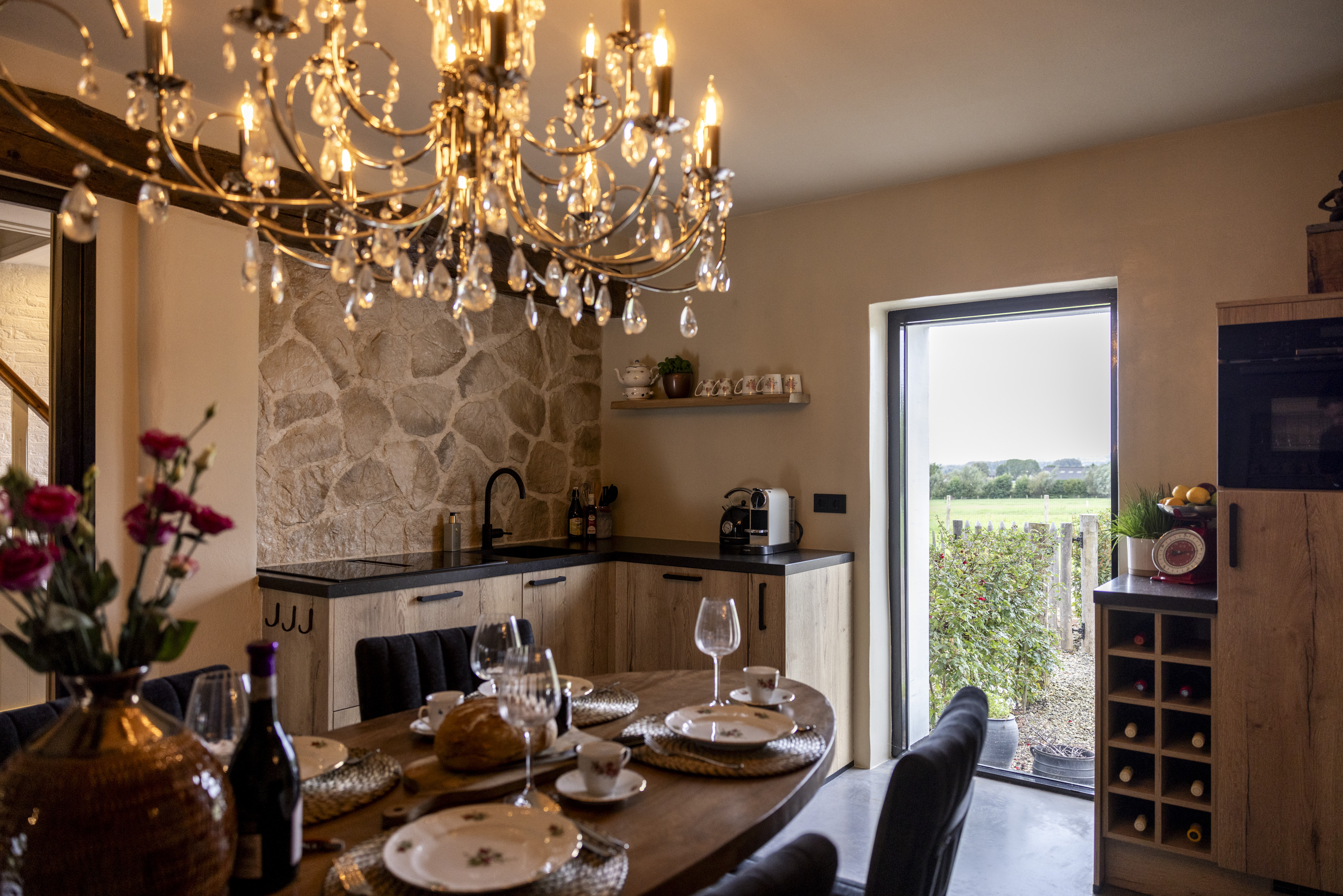 Je komt binnen in een sfeervolle hal die meteen de warme, authentieke stijl van de woning laat zien. De open keuken met uitzicht op het heuvelland is volledig uitgerust.