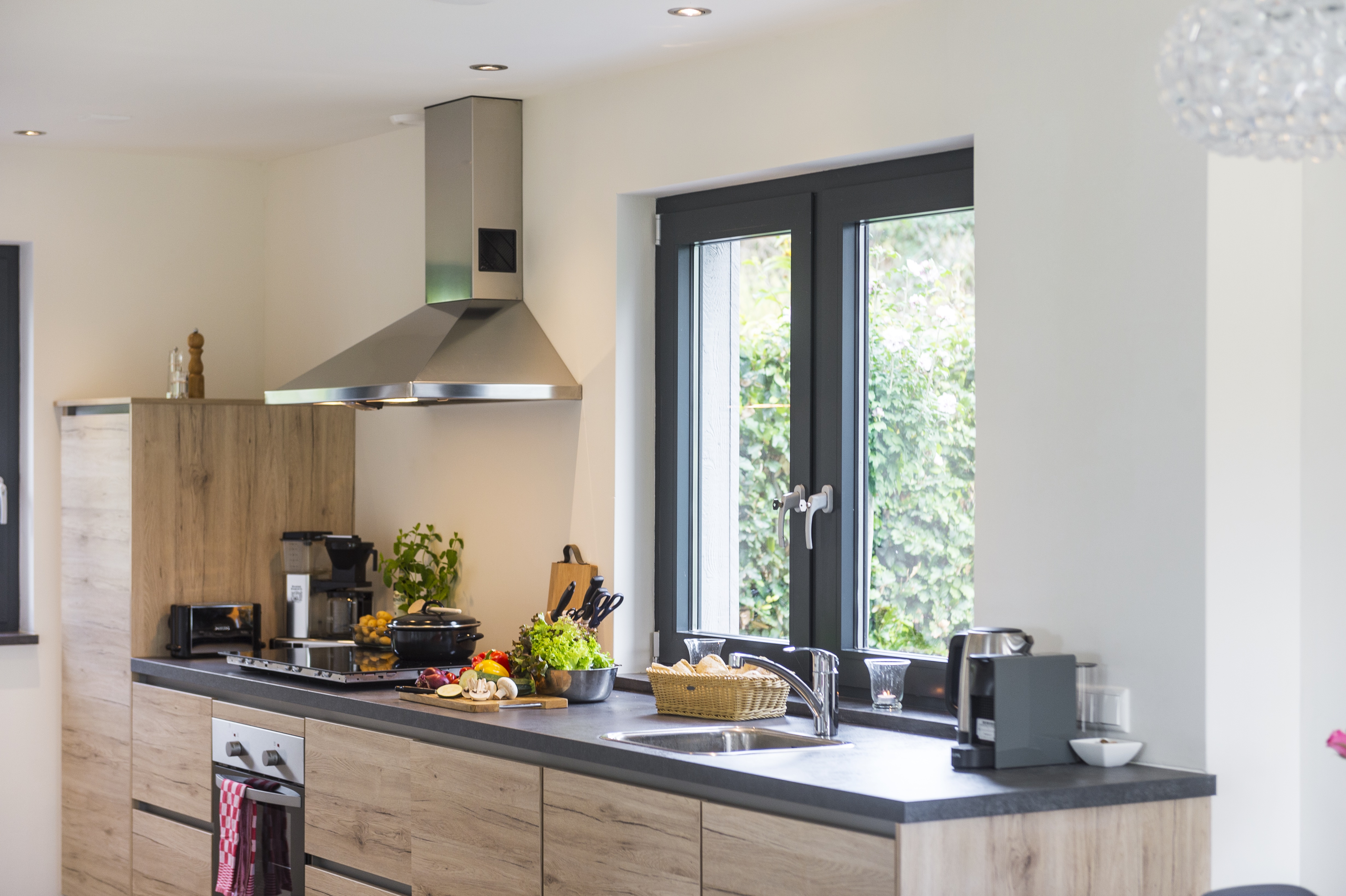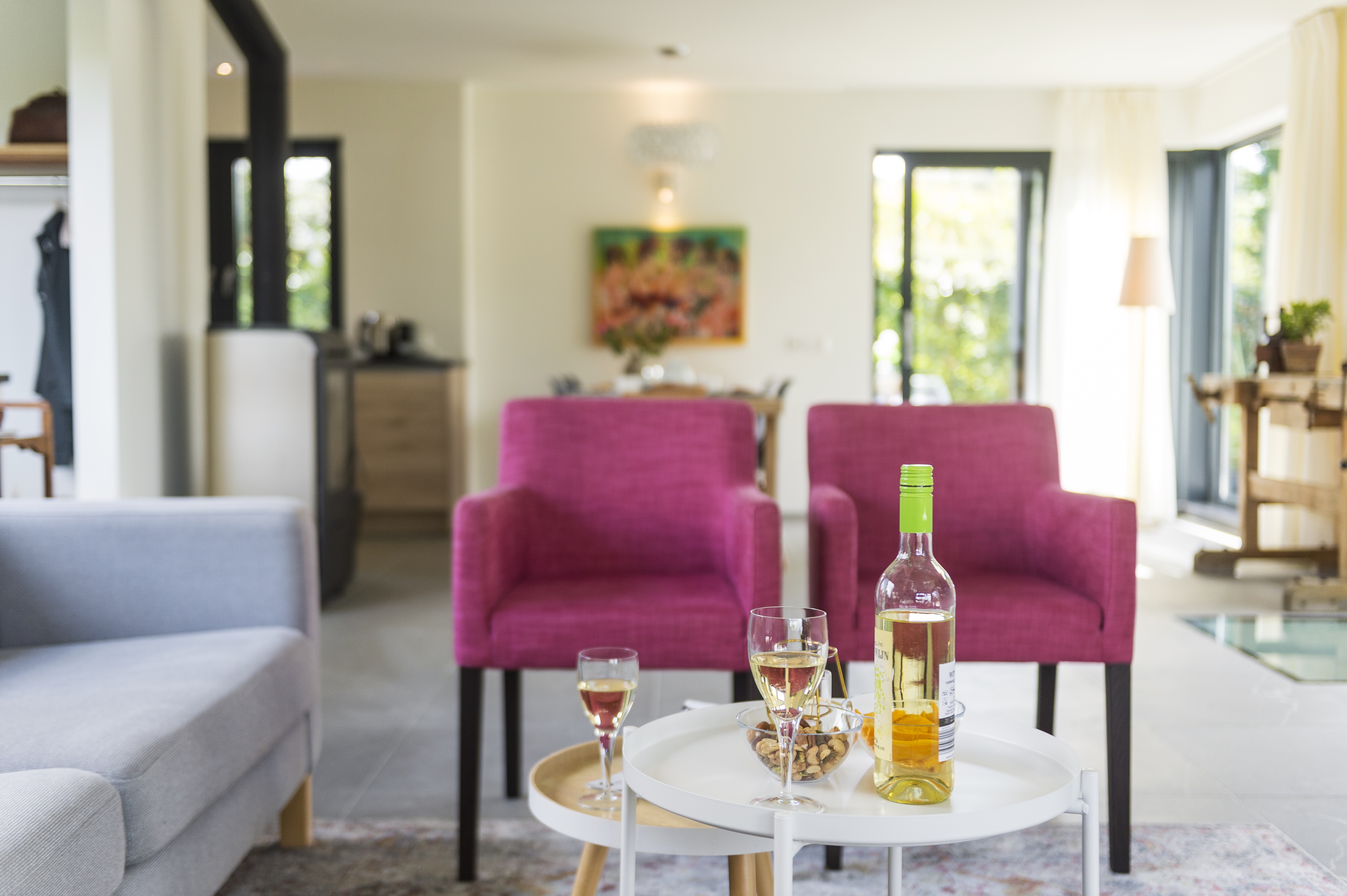 Stap binnen in de lichte leefruimte en geniet van het uitzicht op het weelderige groen. De zithoek met comfortabele banken en televisie is perfect voor een ontspannen avond.