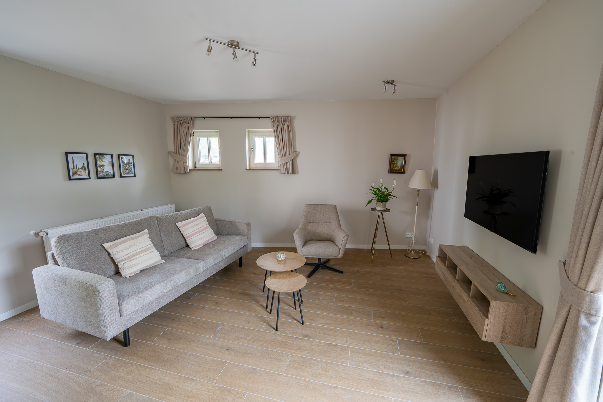 De vakantiewoning is voorzien van een gezellige woonkamer met een groot raam dat uitkijkt over de tuin van de vakantiewoning en de aangrenzende wei/boerderij. Tevens is de woonkamer voorzien van een elektrische sfeerkachel.