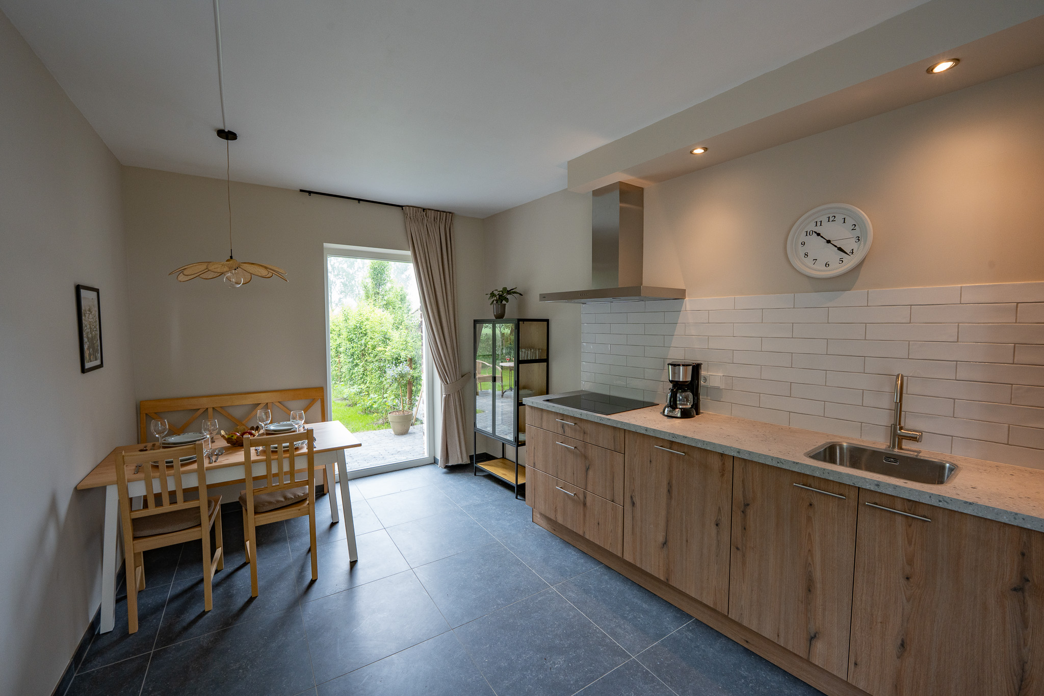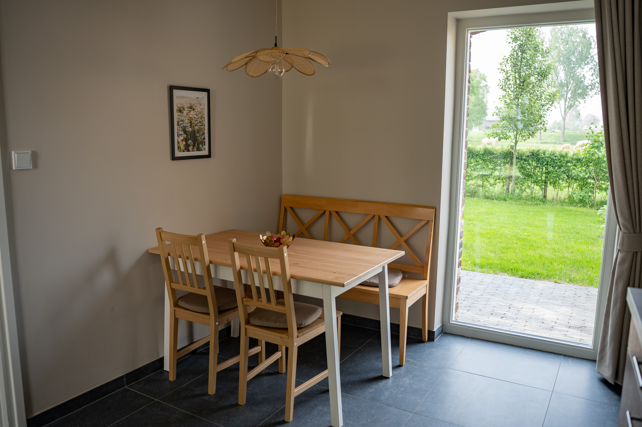 Daarnaast is er een aparte gezellige keuken waarin jezelf lekkere gerechten kunt bereiden, uitkijkend naar het weiland en het laantje.