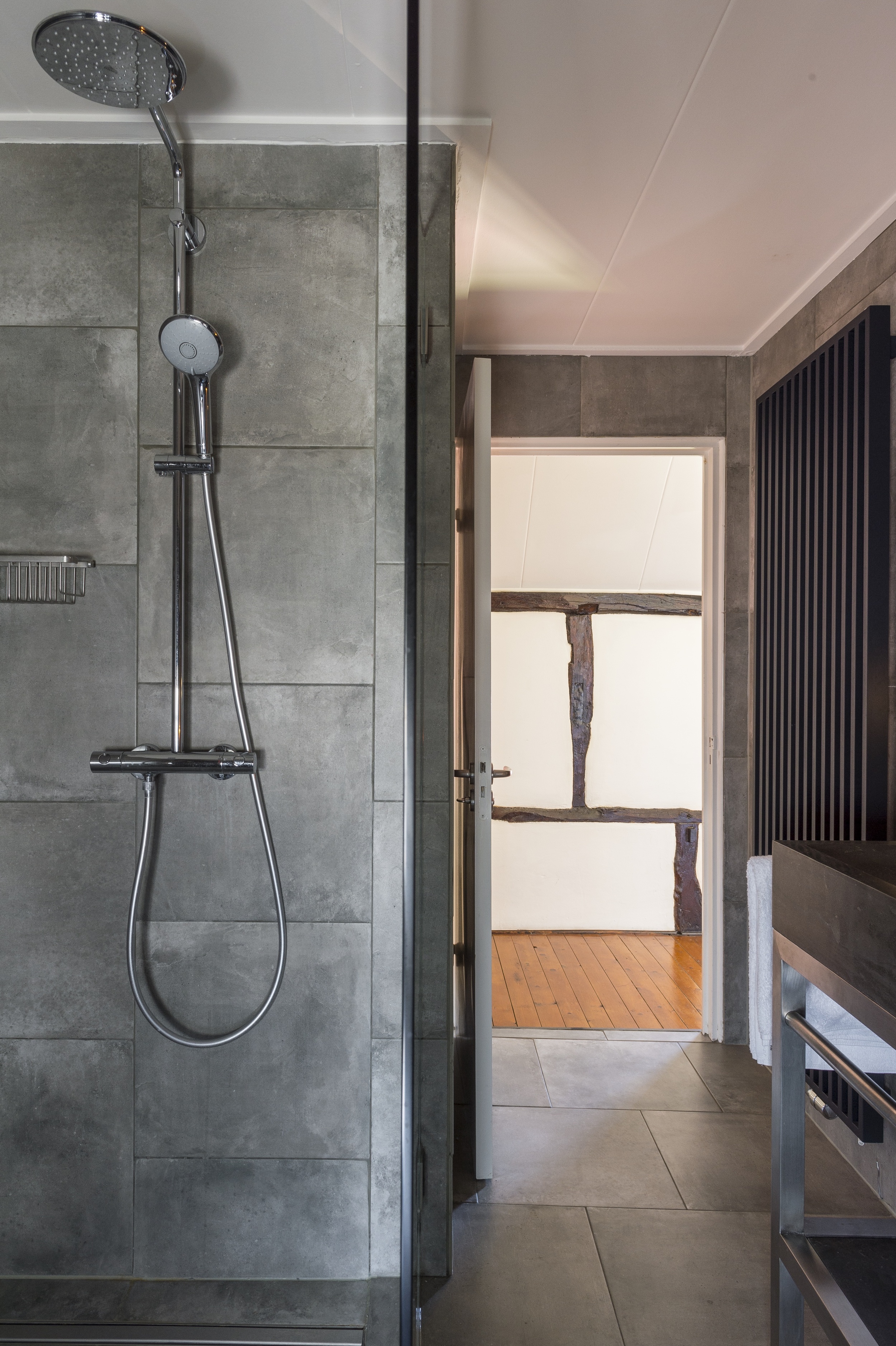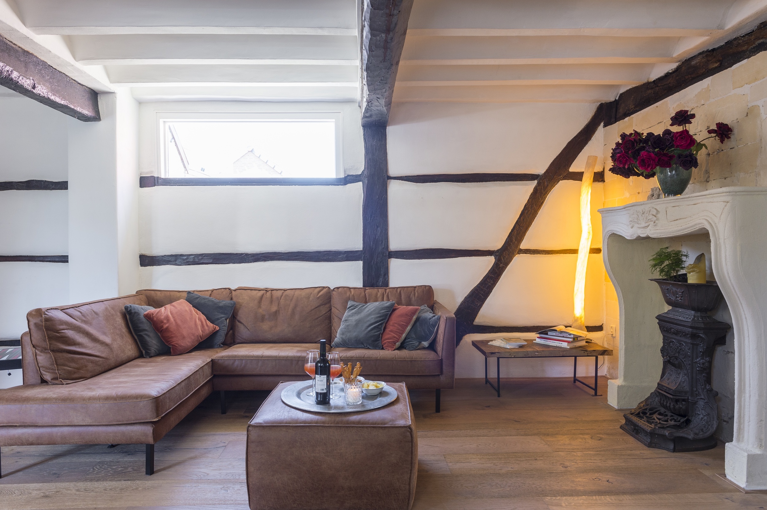 Binnen stap je in een warme leefruimte met eikenhouten vloer, vakwerk en mergelaccenten. Ontspan bij de open haard op de hoekbank of dineer aan de grote eettafel.