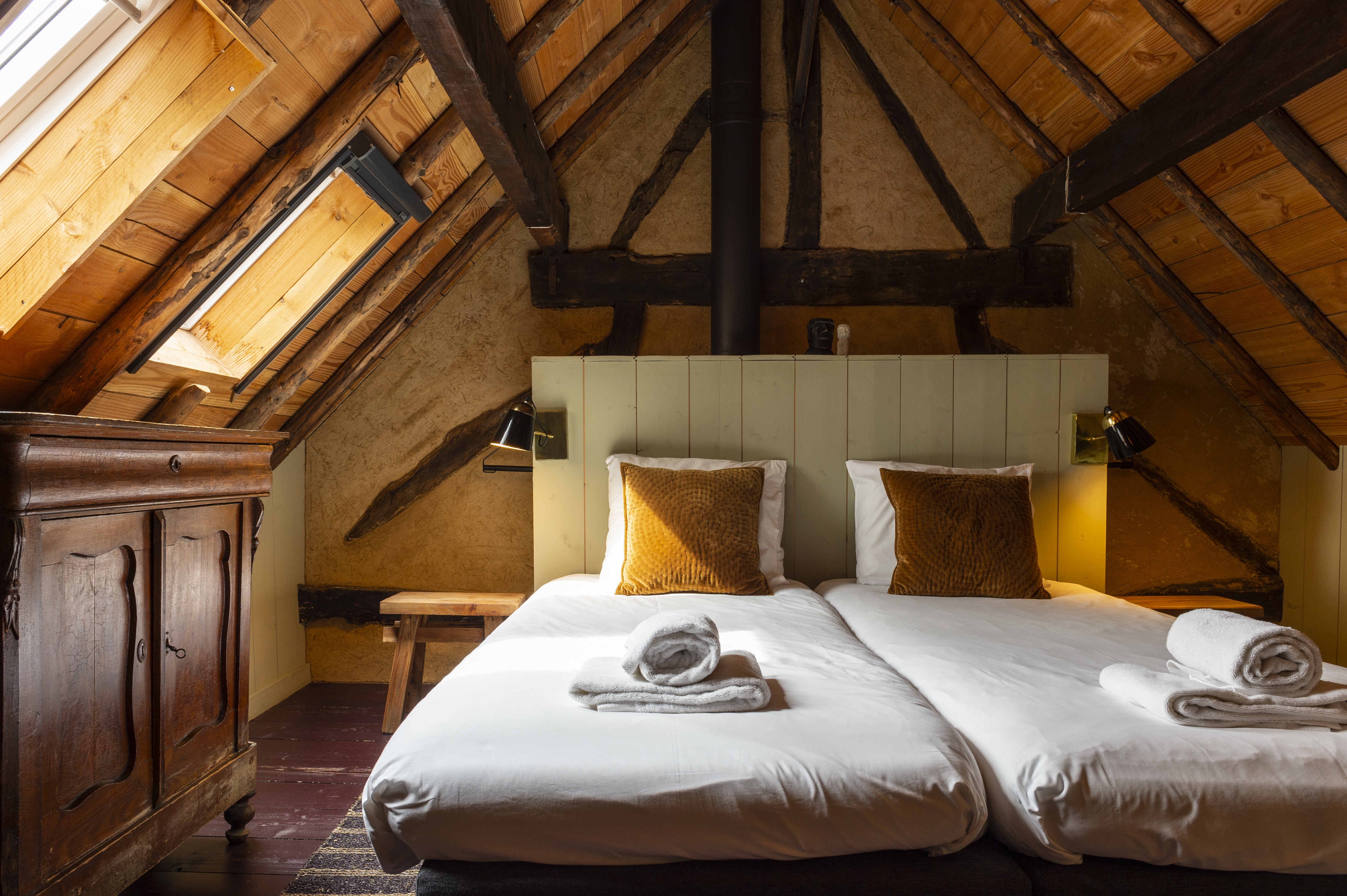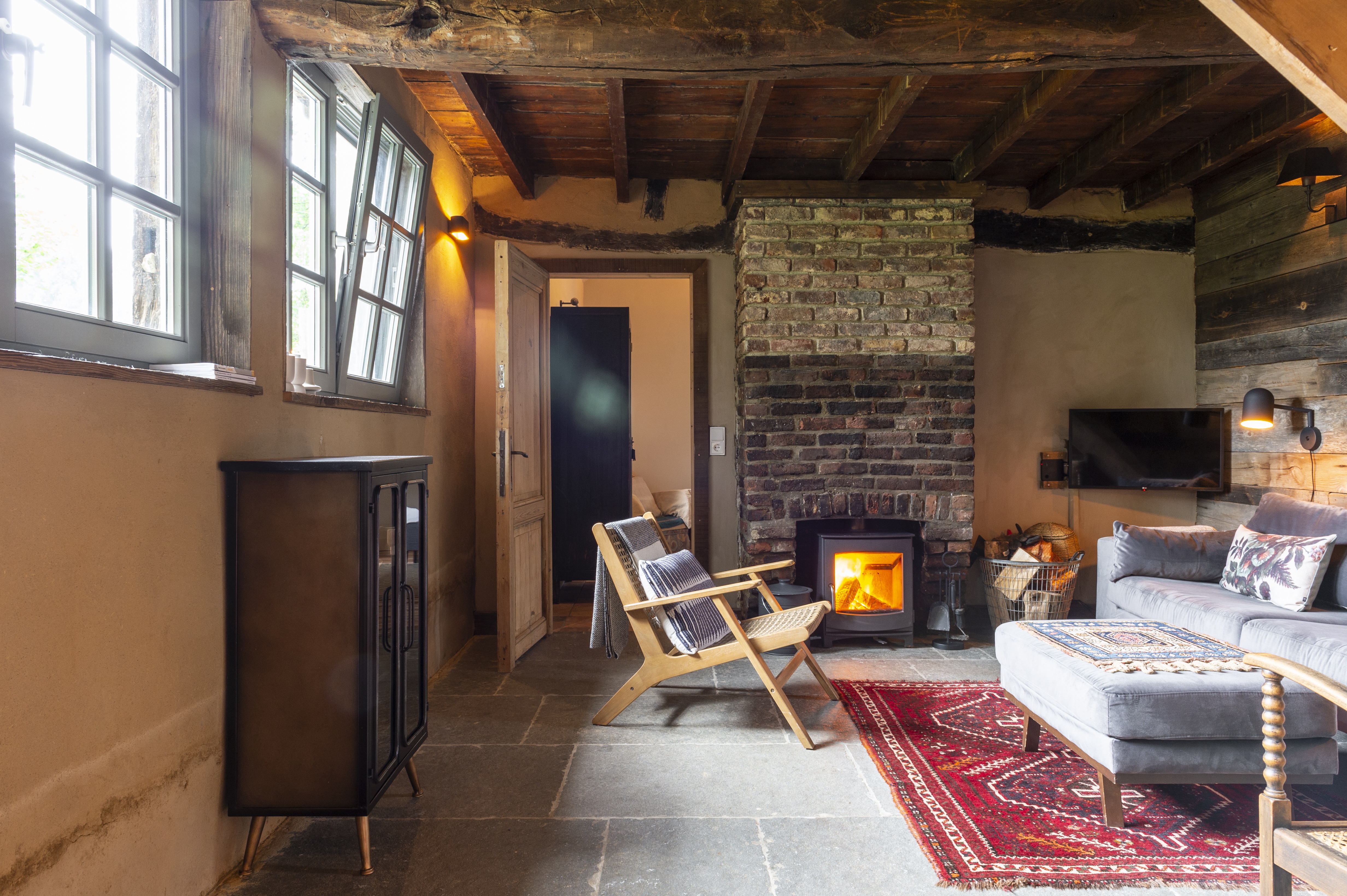 Het bakhuisje, gerestaureerd door Bart en Cecile, combineert authentieke elementen zoals eiken vakwerk en Maaskeien met modern comfort.