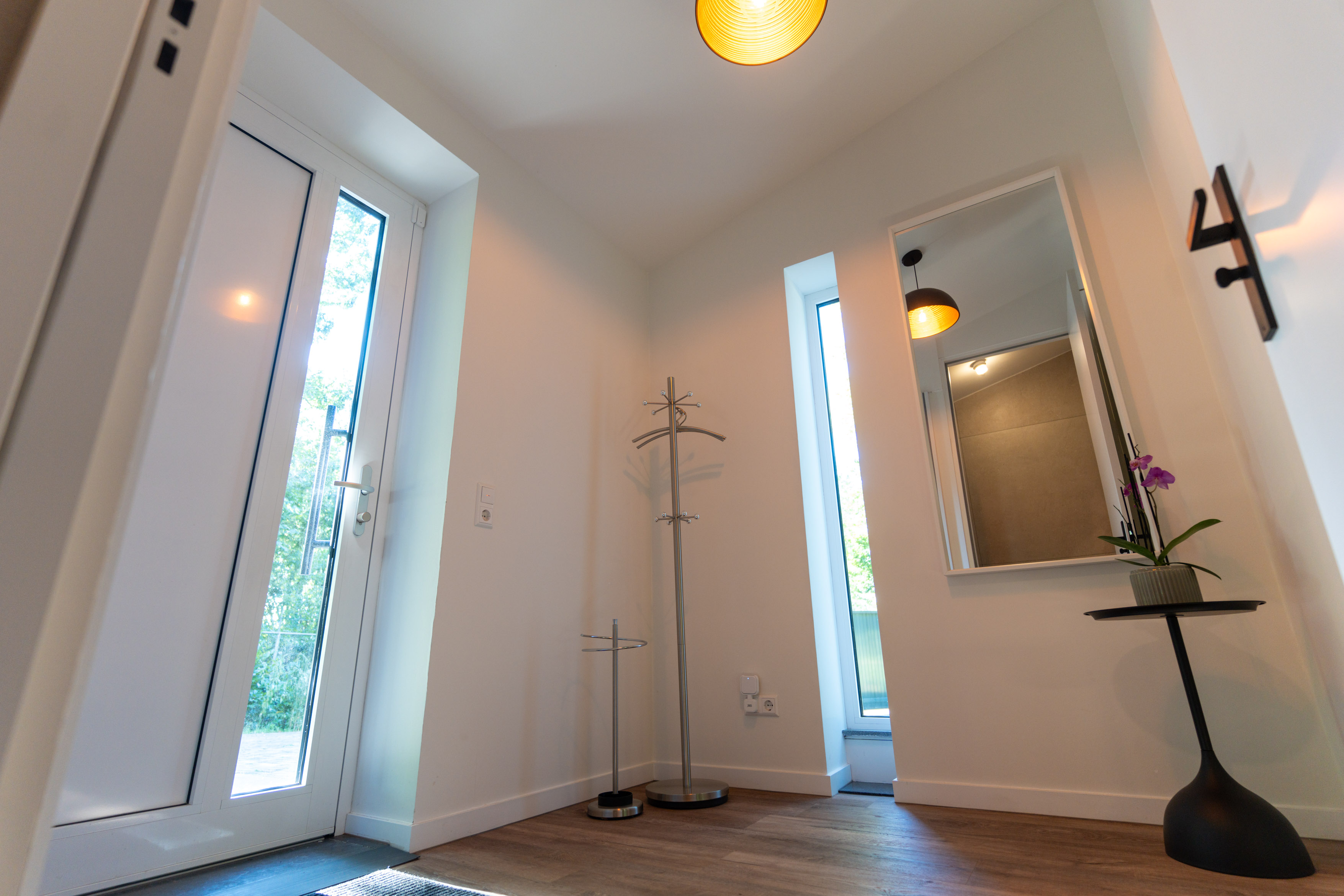 De grote ramen brengen het daglicht naar binnen en geven uitzicht op de tuin. De villa is geschikt voor vier personen en volledig uitgerust. Twee slaapkamers met tweepersoonsbedden en eigen smart-tv's.