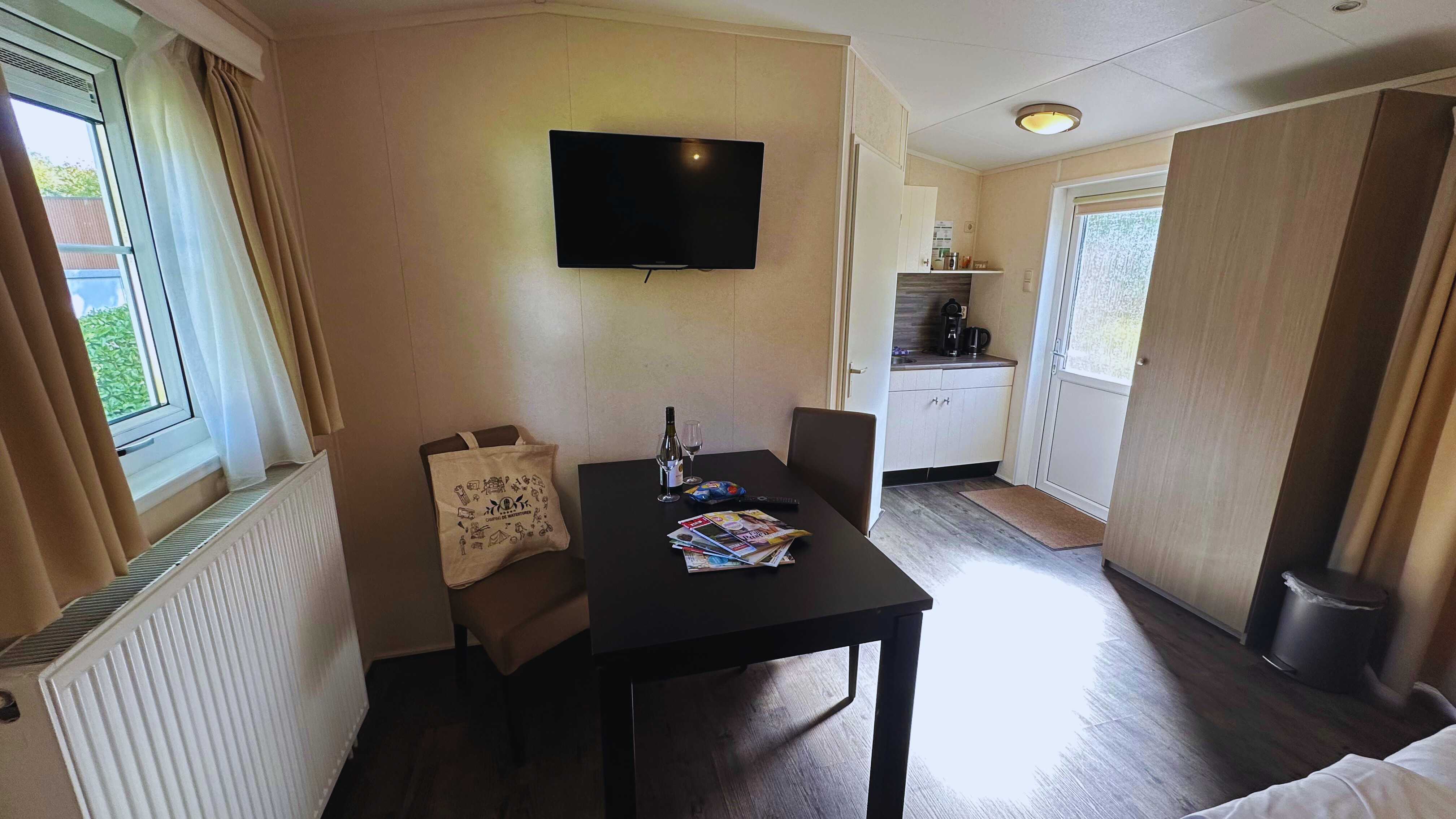 Centrale verwarming, tafel met stoelen, koelkast, inventaris, flatscreentelevisie, handdoeken en toiletartikelen zijn aanwezig. Dagelijks is er een broodjesservice voor een vers ontbijt.