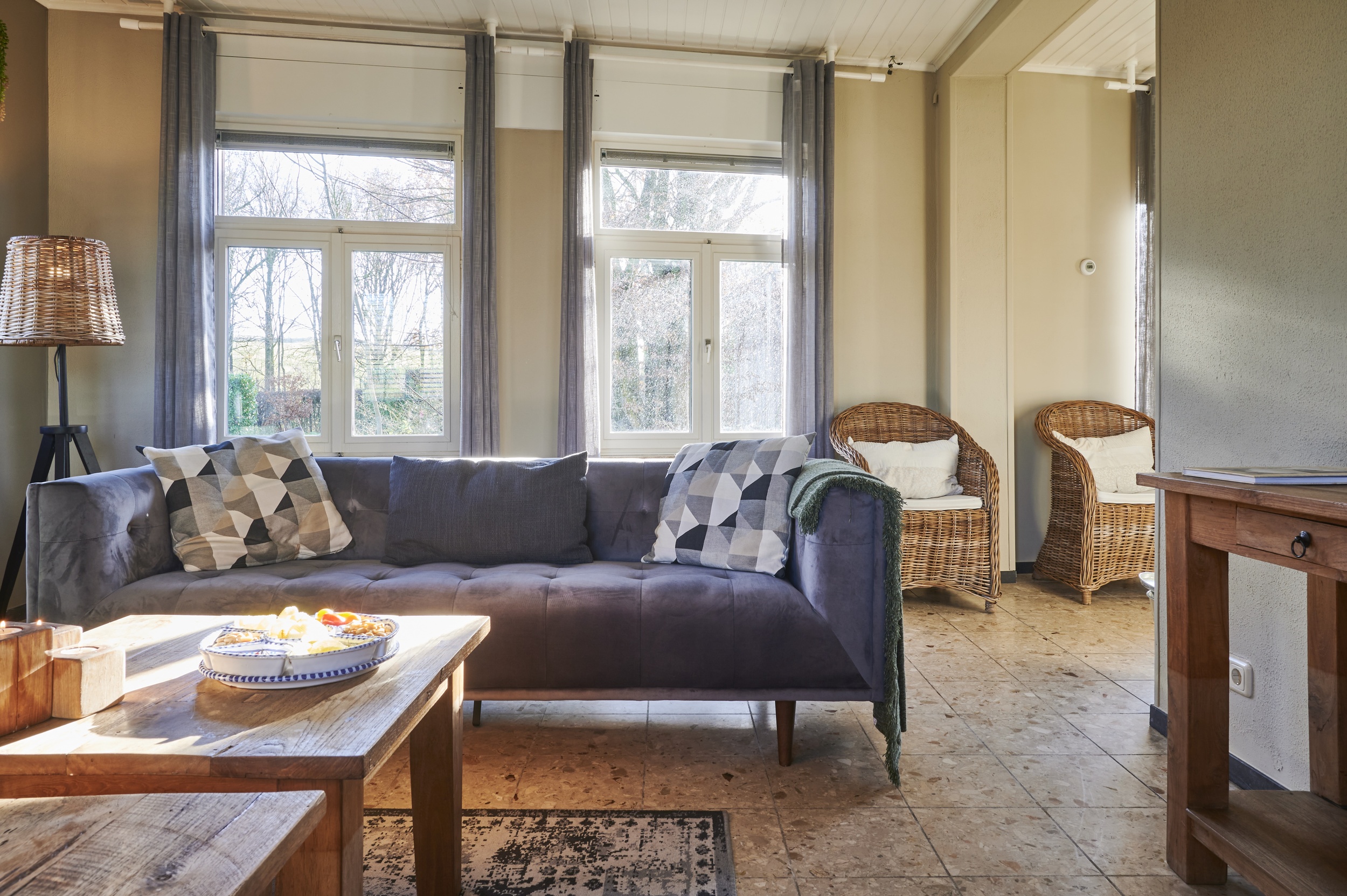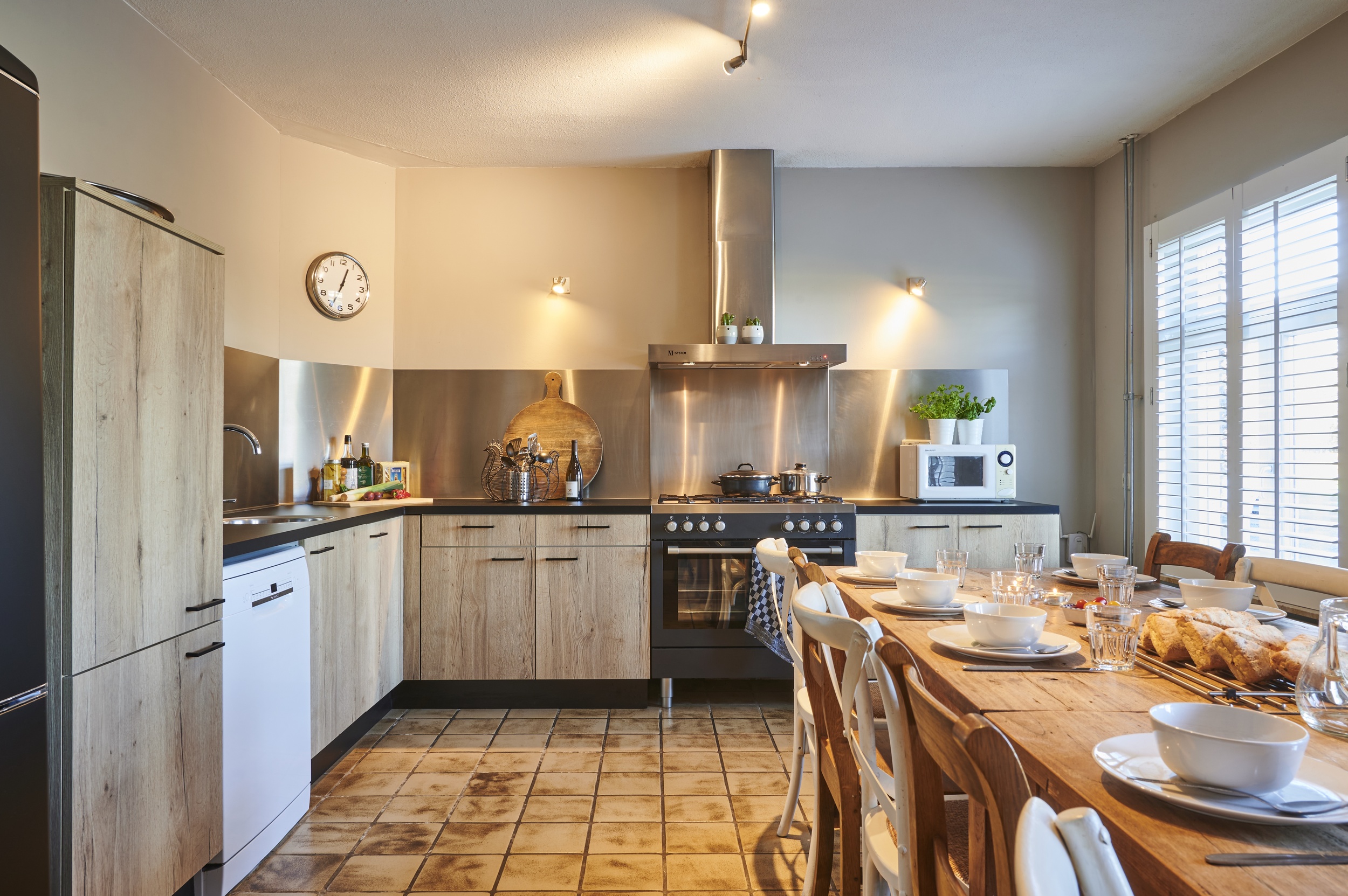 De vakantiewoning beschikt over een ruime woonkamer met twee zithoeken rond een open haard. Aansluitend ligt de grote leefkeuken, voorzien van andere een gasfornuis met zes pitten, een oven, een magnetron en een vaatwasser.