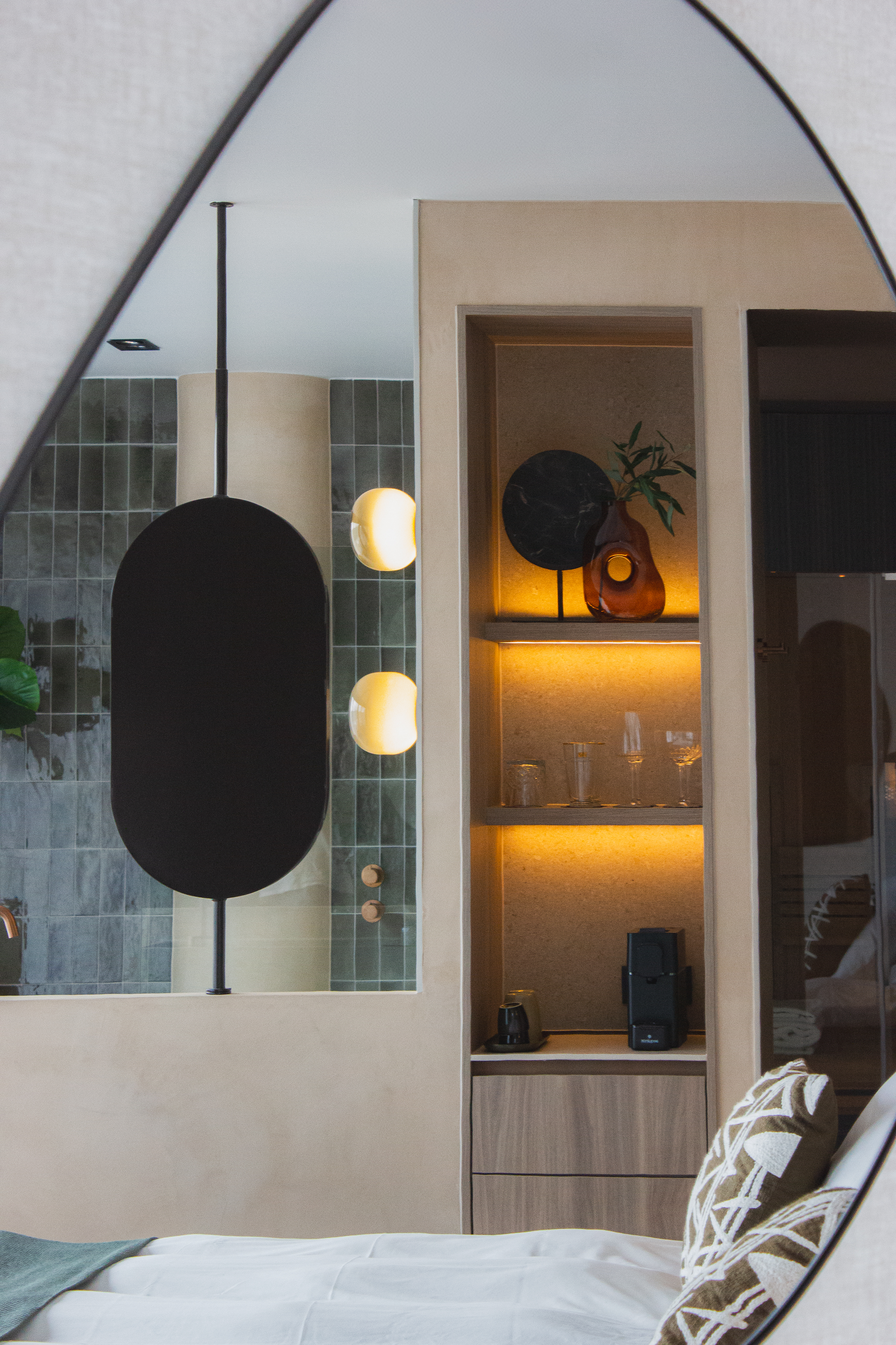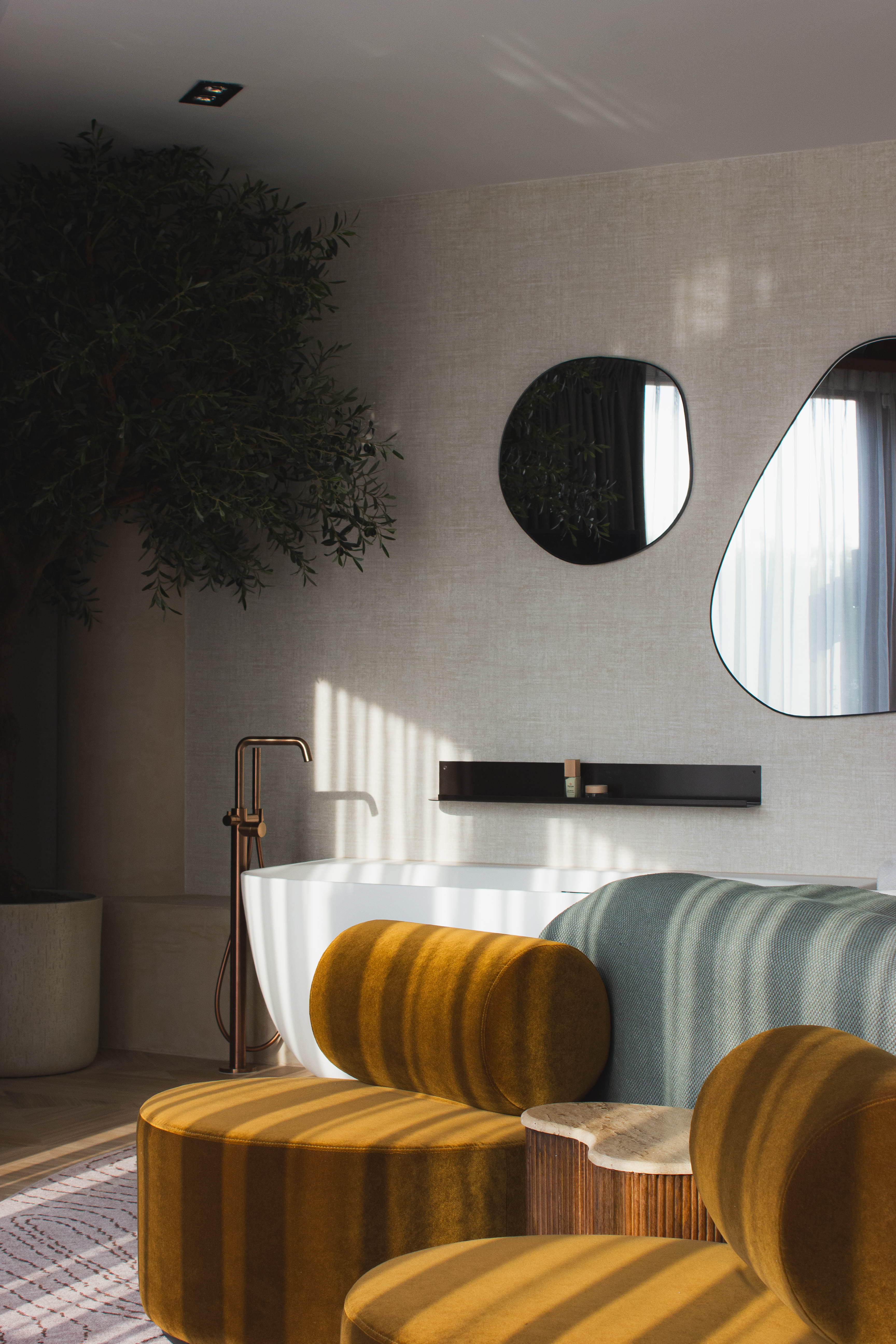 Muren met een zachte gloed, bekleed met tegels die het karakter van lokaal mergelsteen nabootsen, verankeren de kamer in het heuvelland. Hun textuur en kleur verwijzen naar de Limburgse bodem, zonder letterlijk te zijn, een hedendaagse interpretatie met diepe wortels in de regio.