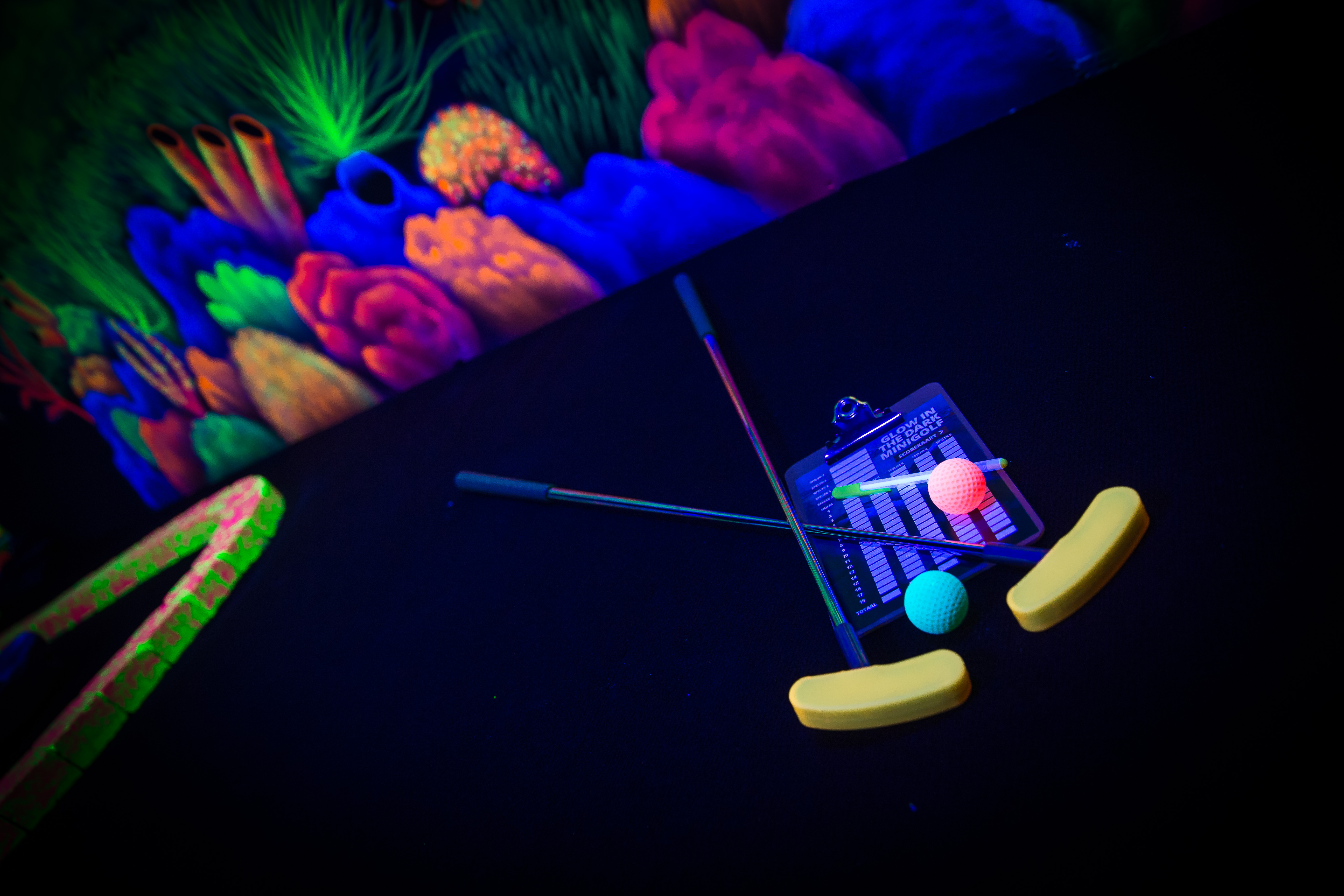 Bij All In Echt beleef je minigolf op een compleet nieuw niveau met Glow in the Dark Minigolf. Dit unieke spel combineert de klassieke charme van minigolf met een omgeving vol fluorescerende kleuren en indrukwekkende lichteffecten.