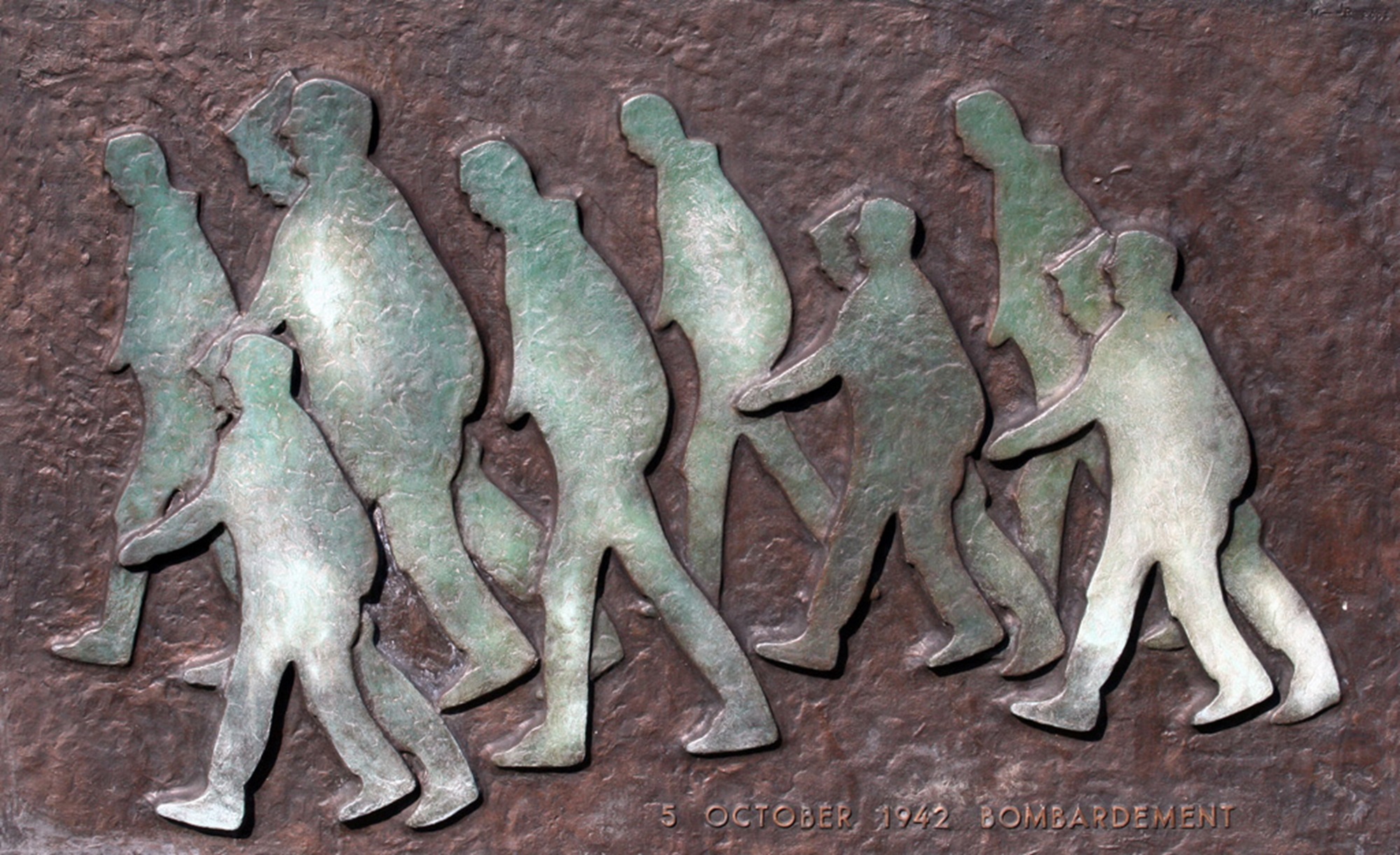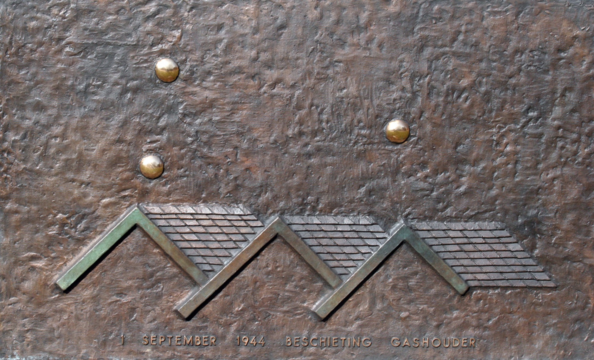 Het verhalende reliëf herdenkt twee dramatische gebeurtenissen: de beschieting van de gashouder op 1 september 1944 en het bombardement op Geleen op 5 oktober 1942.