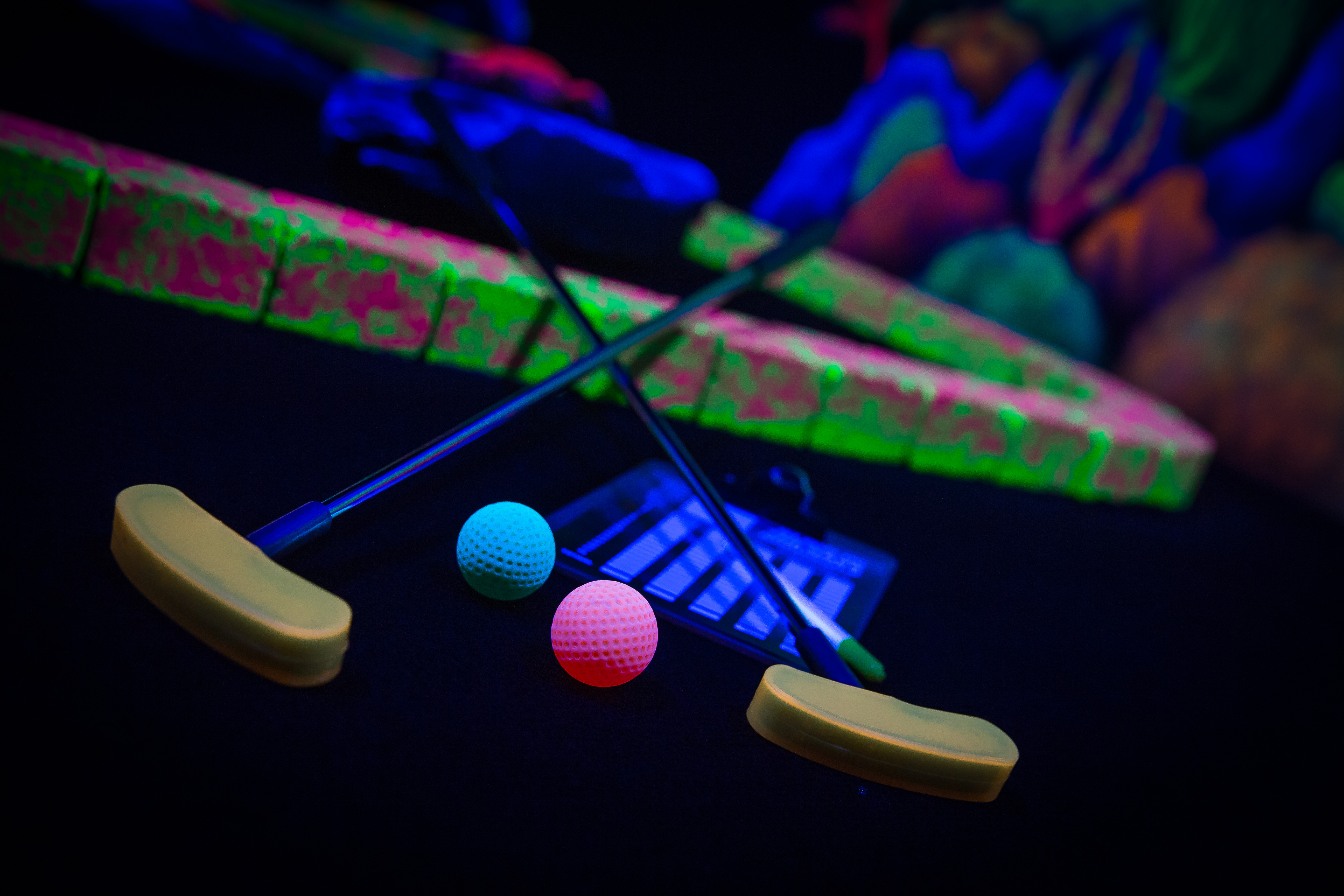 Combineer de klassieke charme van minigolf met een omgeving van fluorescerende kleuren en lichteffecten.
