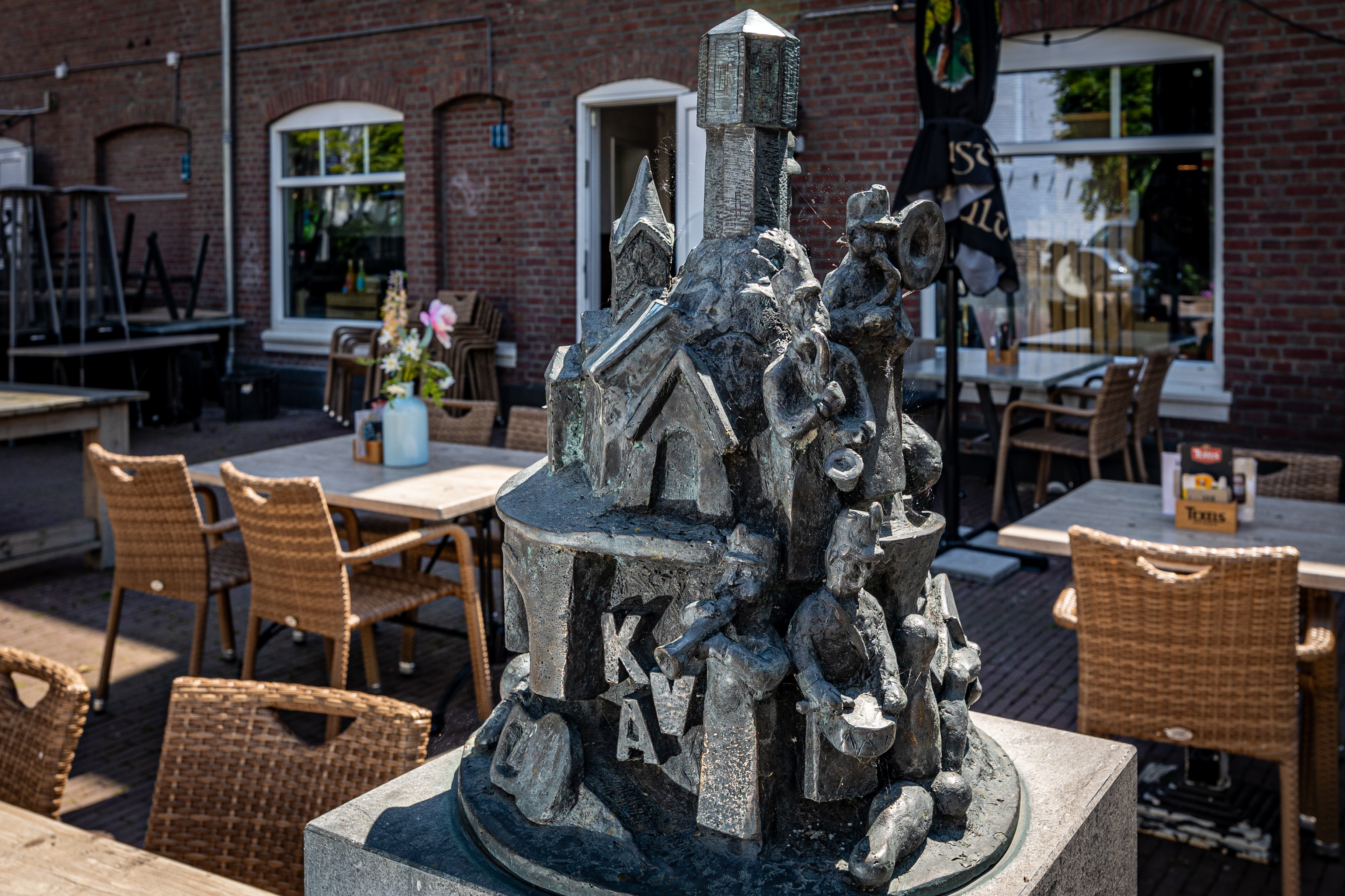 Eromheen staan diverse figuren uit het verenigingsleven. Op het beeld zijn twee tekstjes te lezen: D'r Eck (gemeenschapshuis) en KAV (vrouwenvereniging Rimburg).