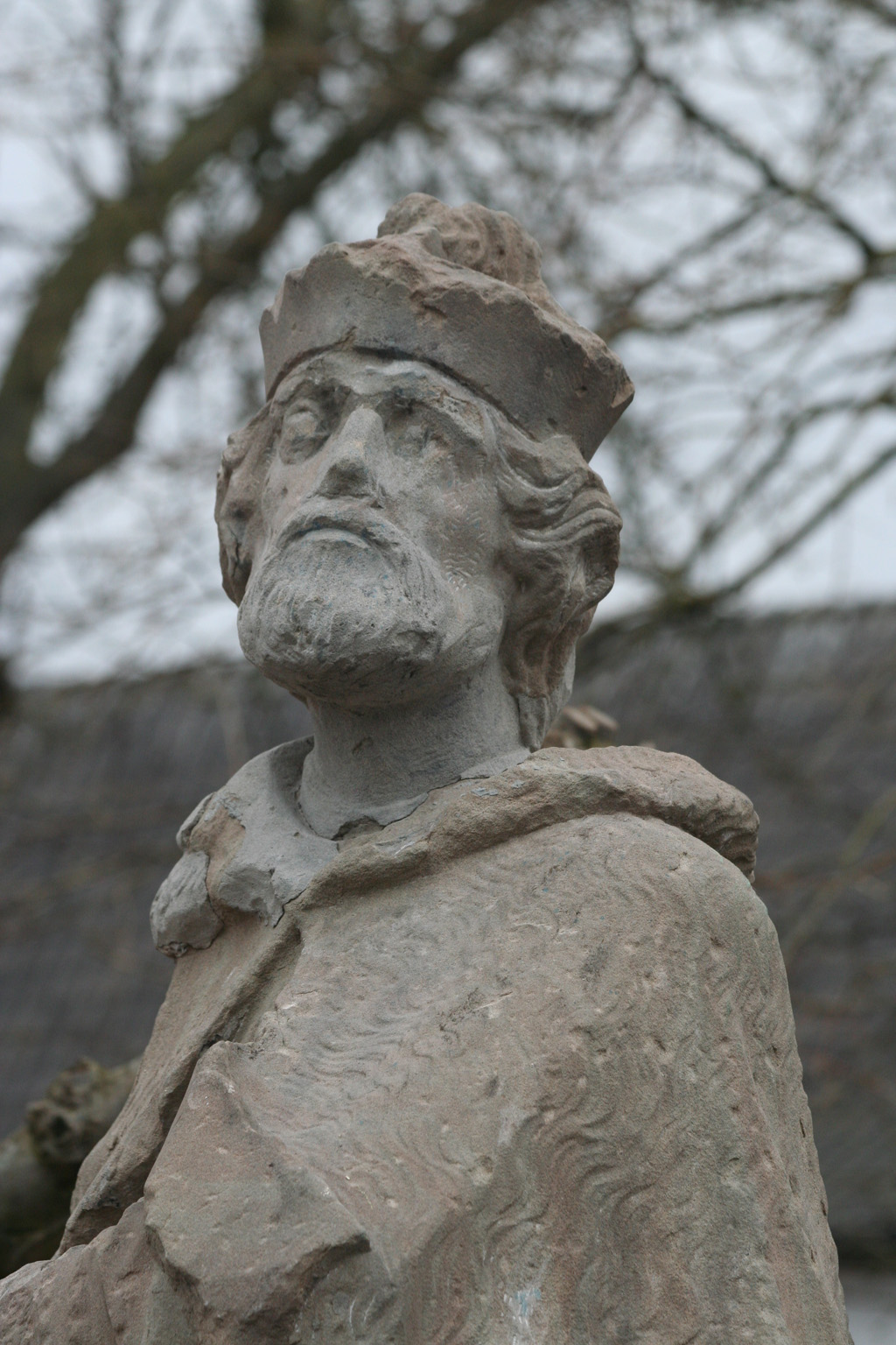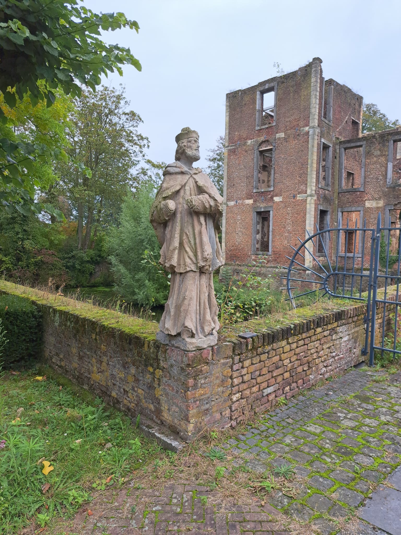 de linker muur van de brug die naar de kasteelruïne leidt, staat een beeld van
