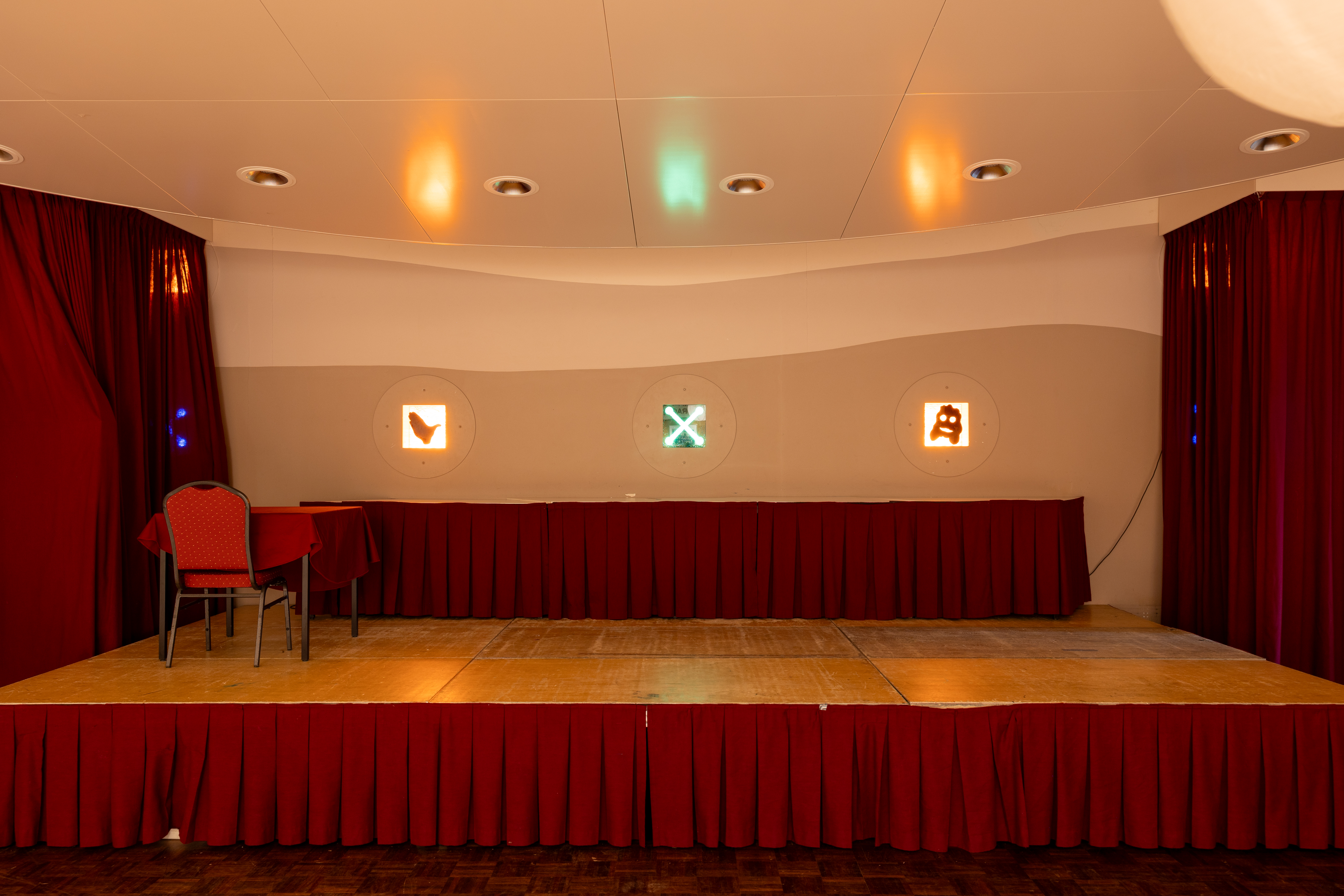 Door gebruik te maken van verschillende lagen gekleurd en helder glas krijgt het gebouw ’s avonds een bijna magische uitstraling.