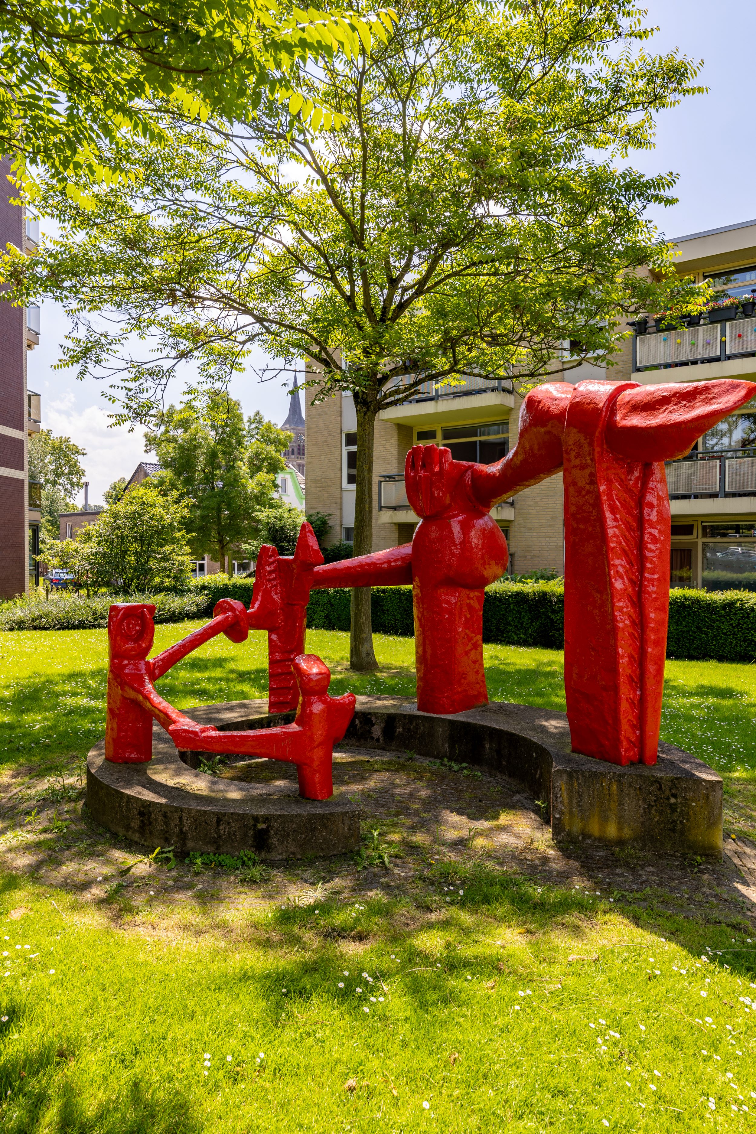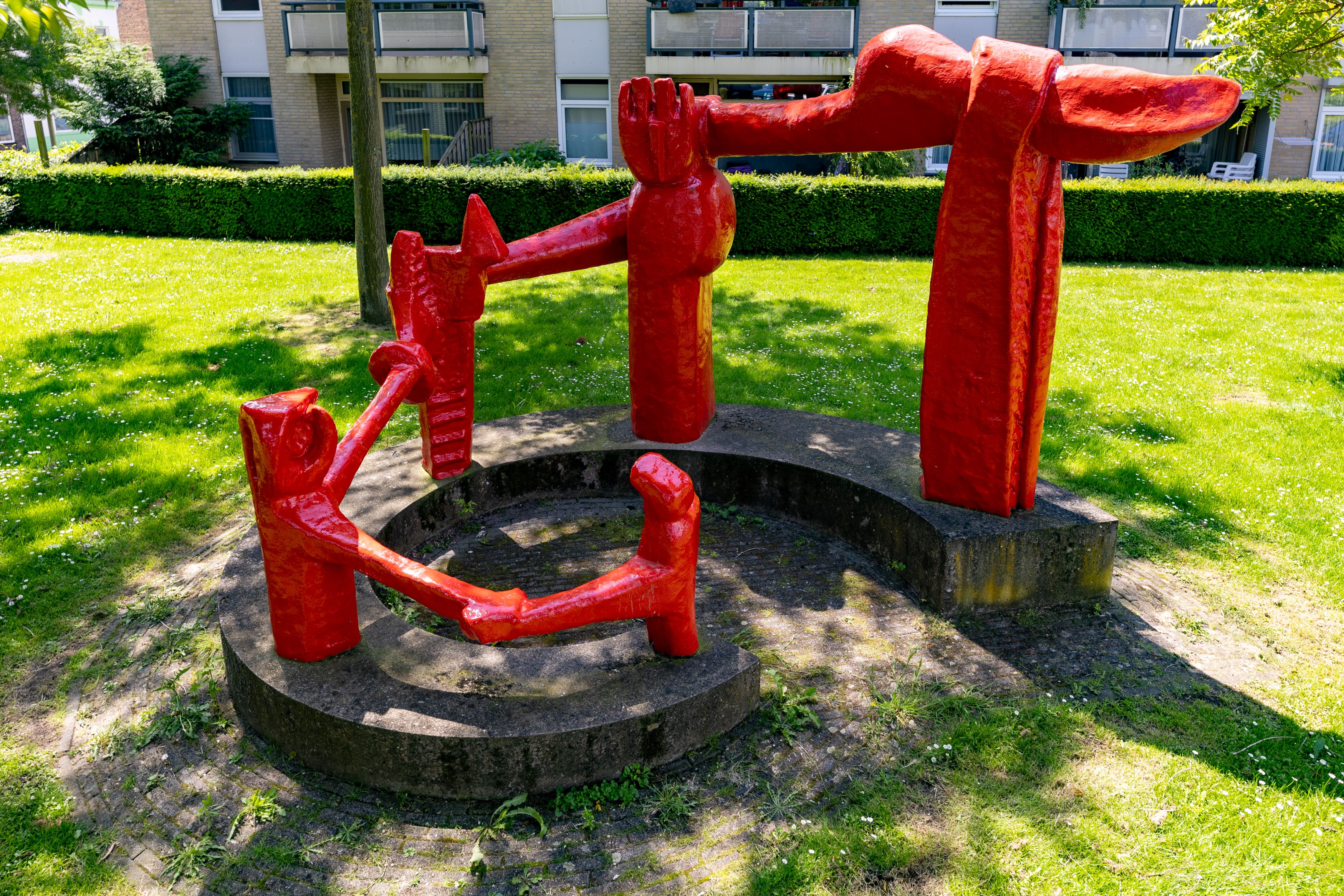 Mensen van allerlei leeftijden en generaties ontmoeten elkaar. Kinderen willen spelen, dansen, zingen. De kunstenaar heeft die cyclus verwerkt in het beeld.