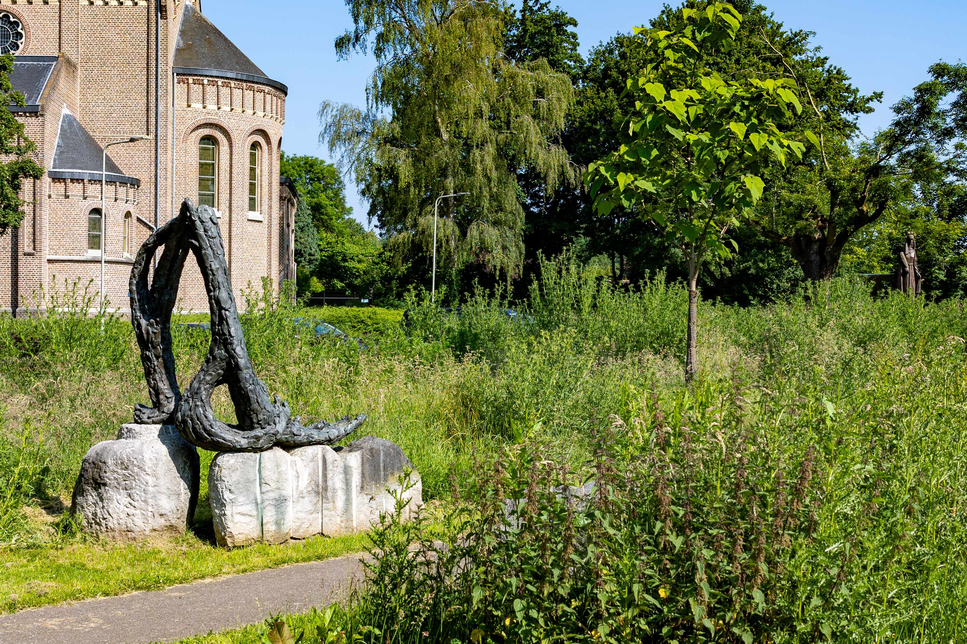 Twee van de stenen zijn met elkaar verbonden door een hoge amorfe vorm in brons. Deze vormt als het ware de verbinding tussen oorsprong en oneindigheid, een energiestroom, vrij en ongebonden.