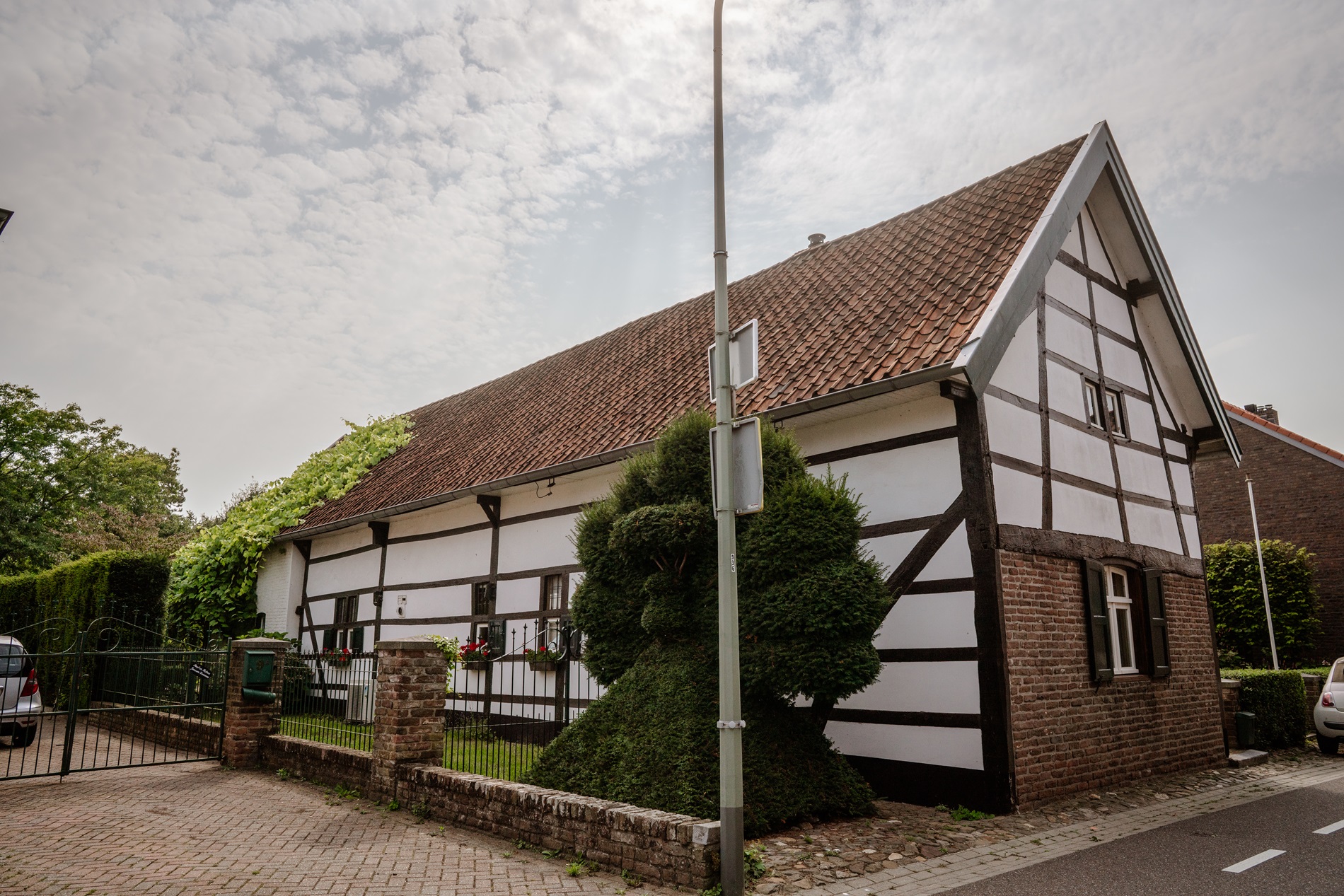 Een vakwerkhoeve uit de 18e eeuw waarvan de voor- en