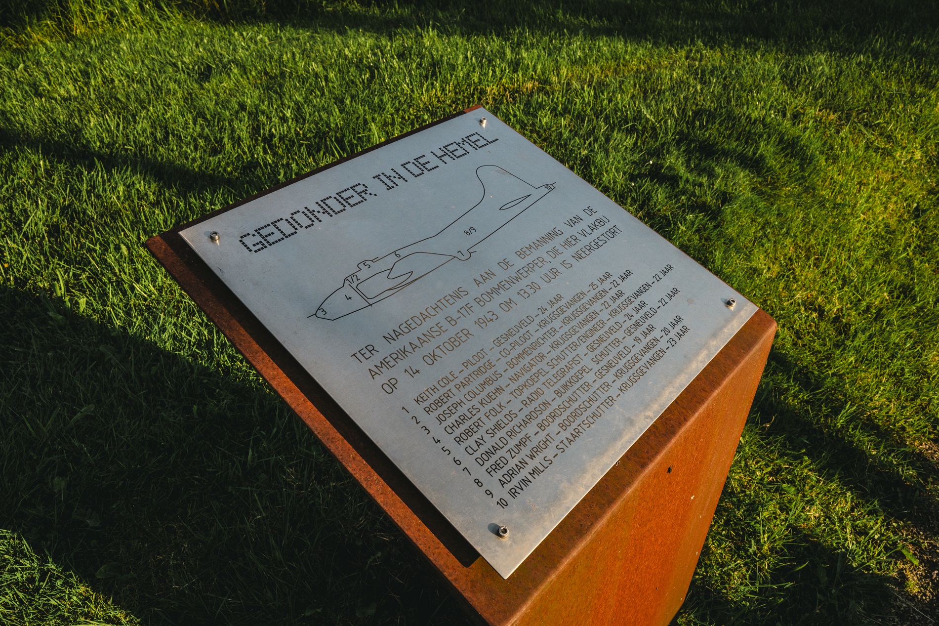 NAAR DE GROND, DAAROM LOPEN WIJ VRIJ ROND”. Op een aluminium plaquette zijn de namen en vliegtuigposities