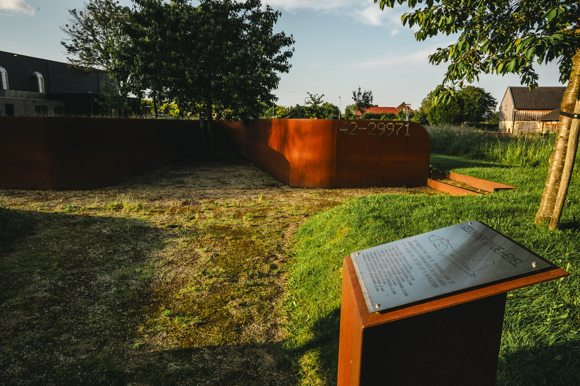 uitgevoerd in Cortenstaal en beeldt het neergestorte toestel uit, deels onder