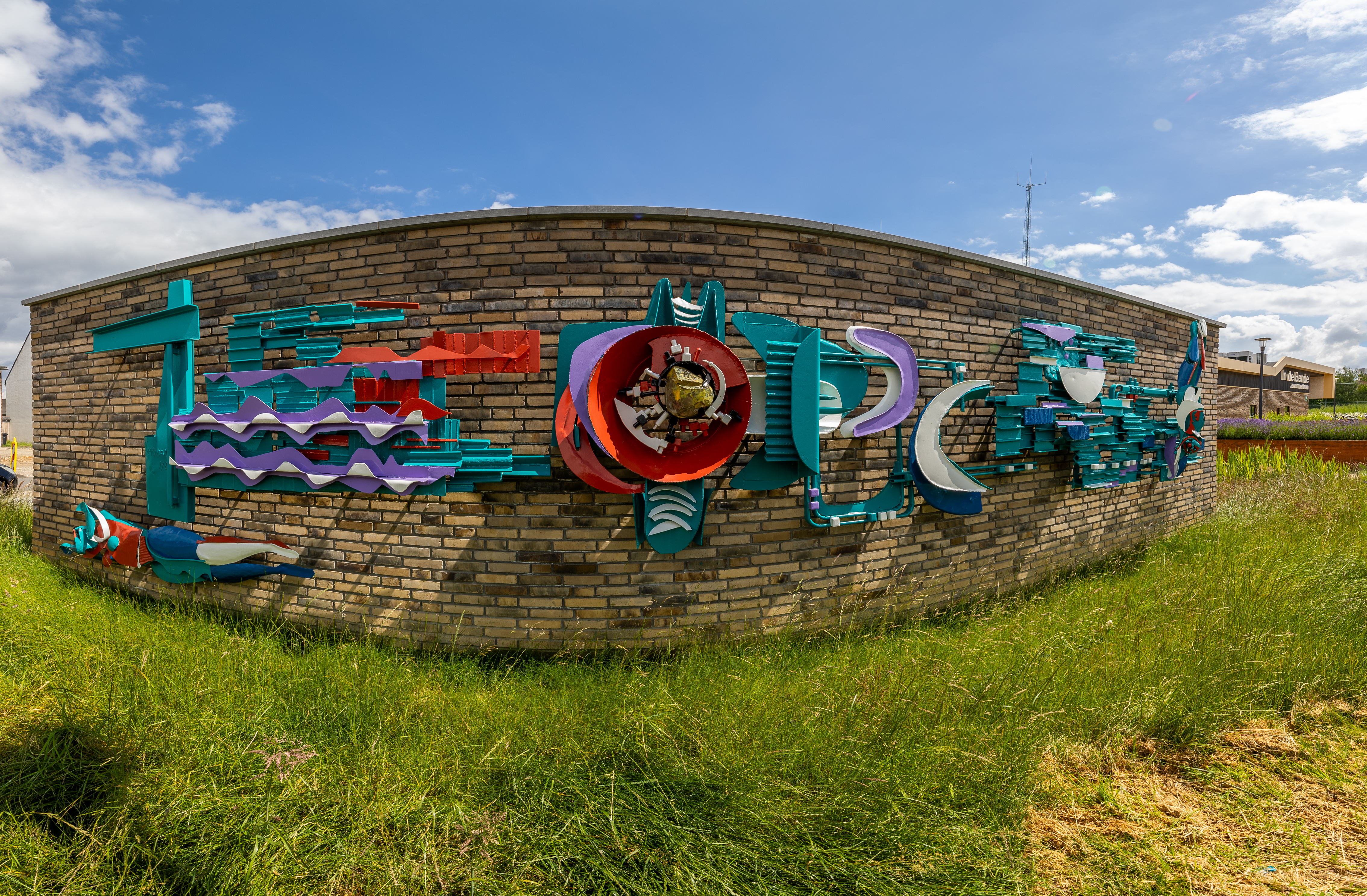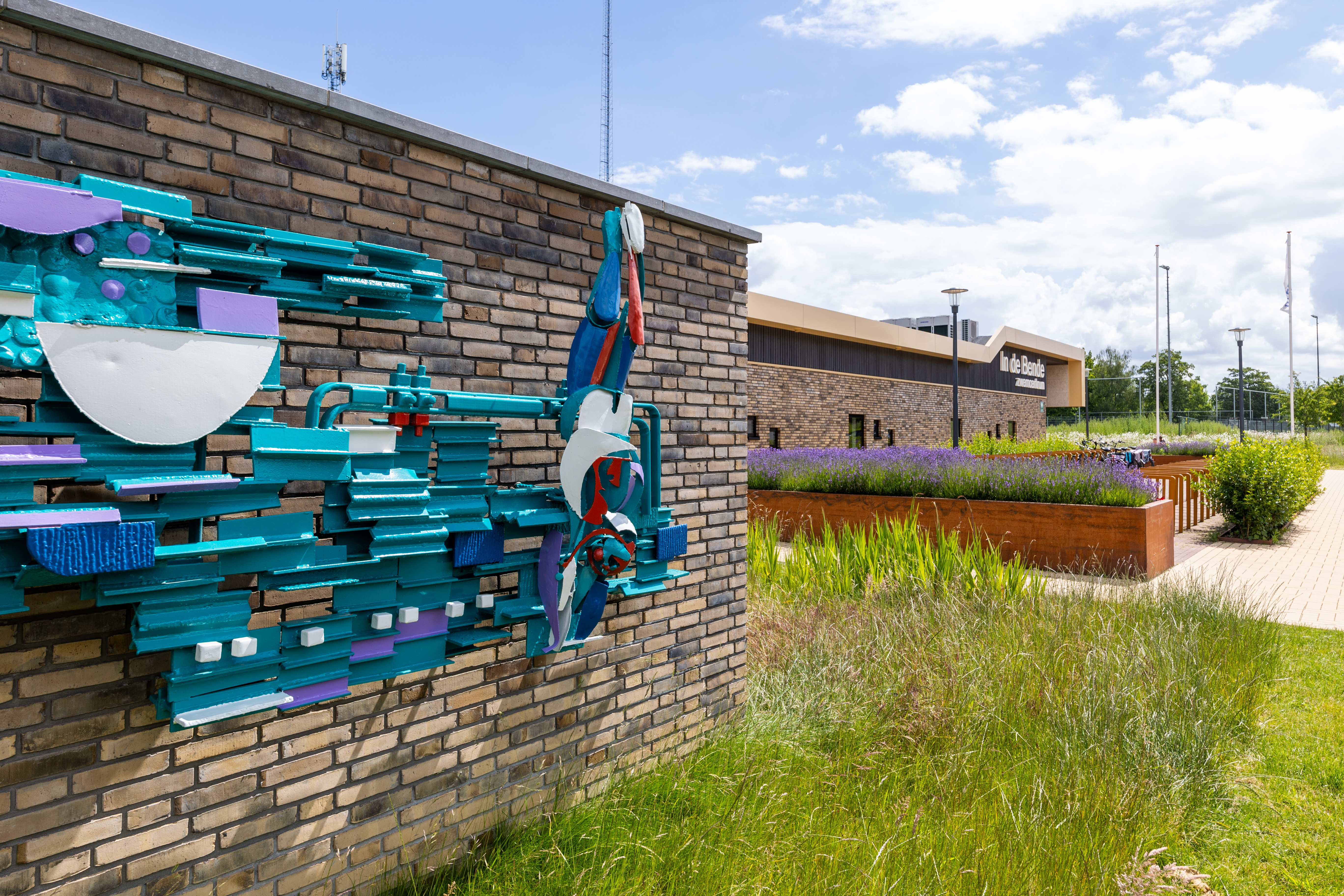 Dit wandplastiek hing oorspronkelijk aan het oude zwembad Nieuwhovenbach, later In de Bende genaamd. Het heeft bij de bouw van het nieuwe zwembad een nieuwe plek gekregen
