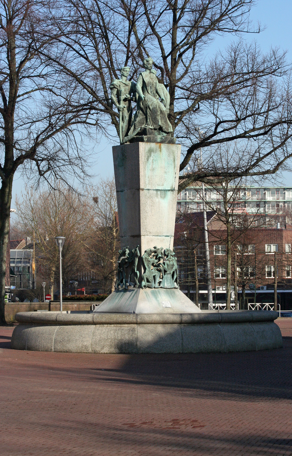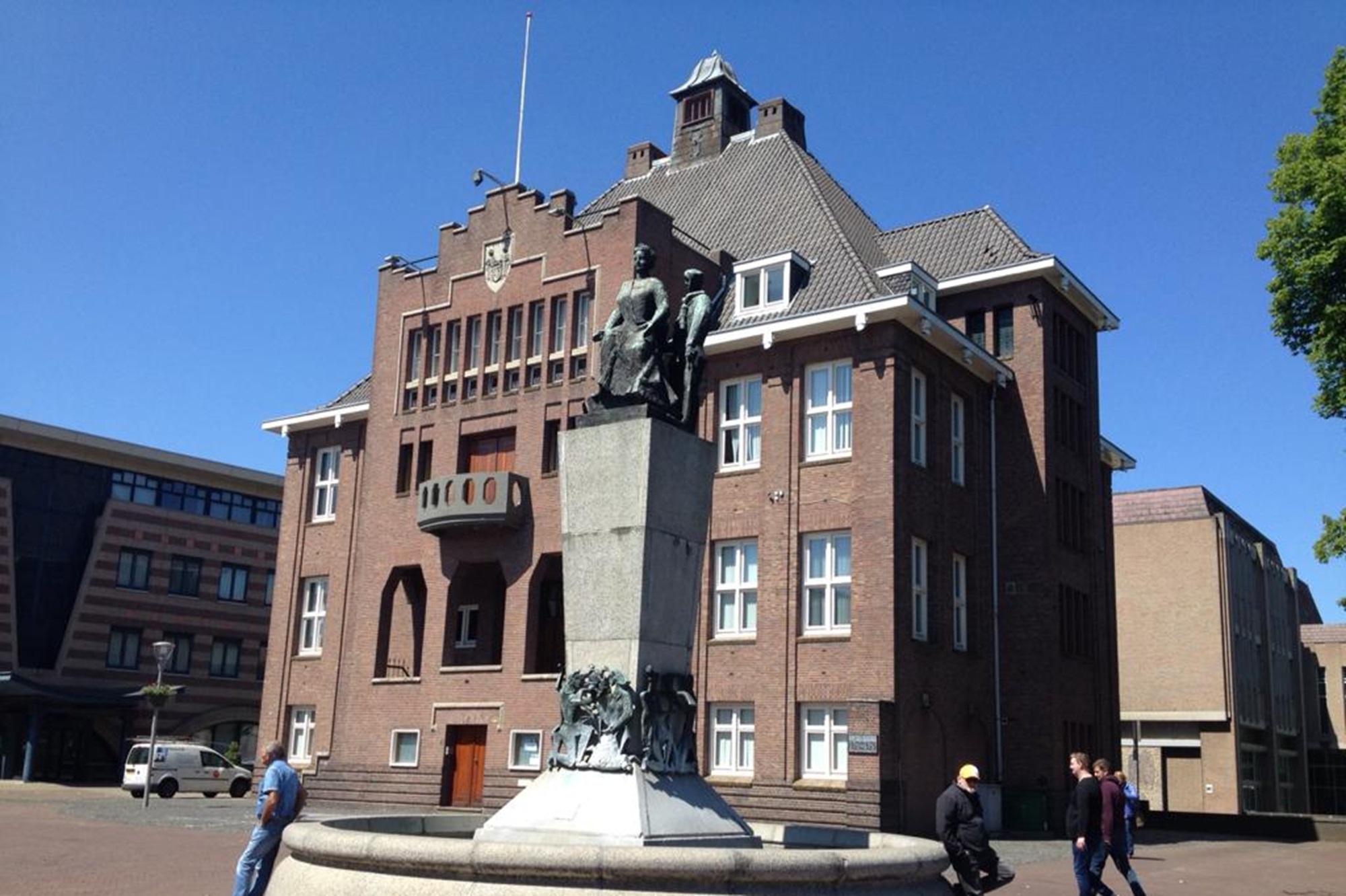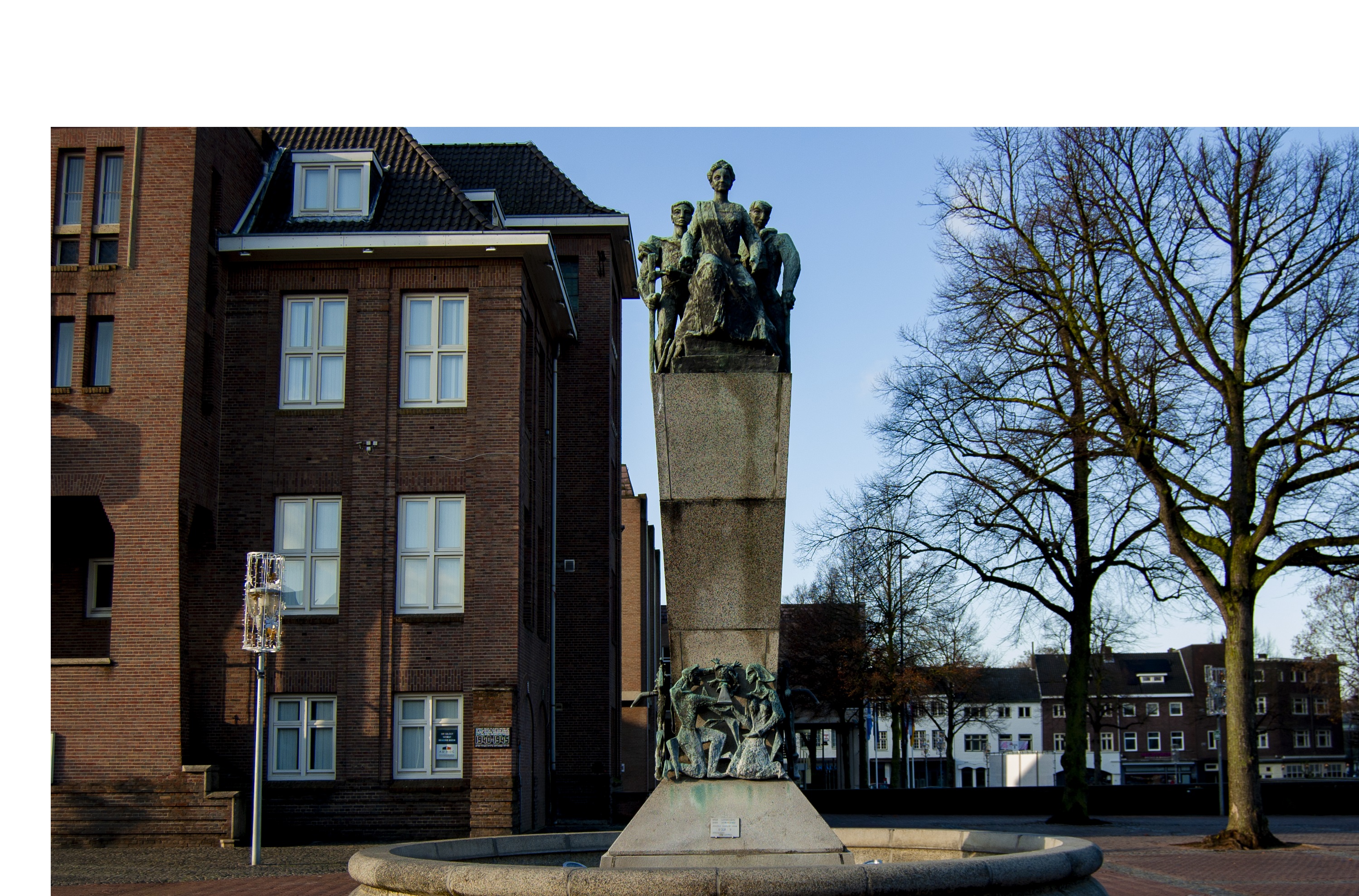 definitieve, plek bij het oude stadhuis. Vanaf een statige zuil kijkt koningin