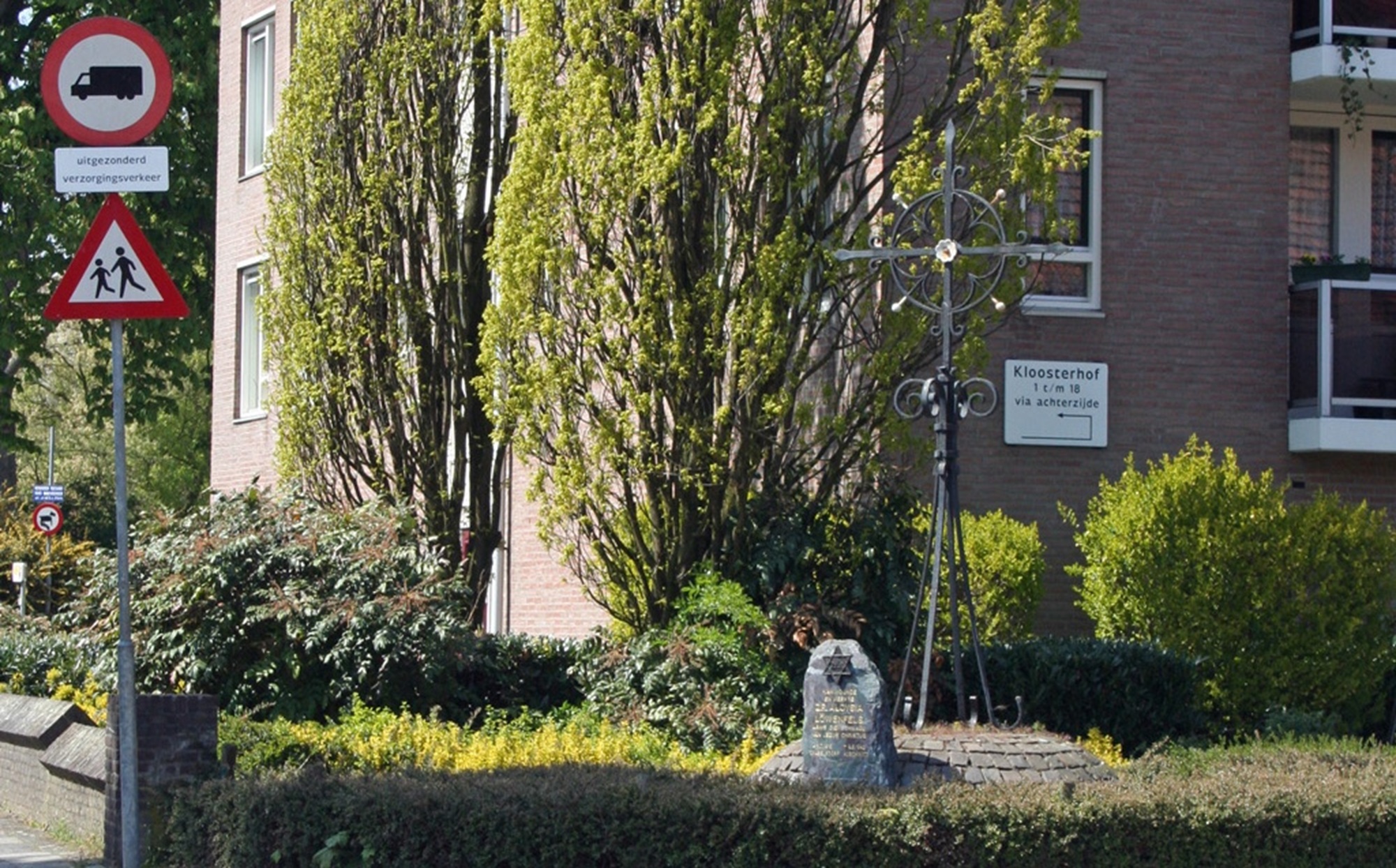 kinderkopjes, een smeedijzeren kruis en een bronzen jodenster op natuursteen.